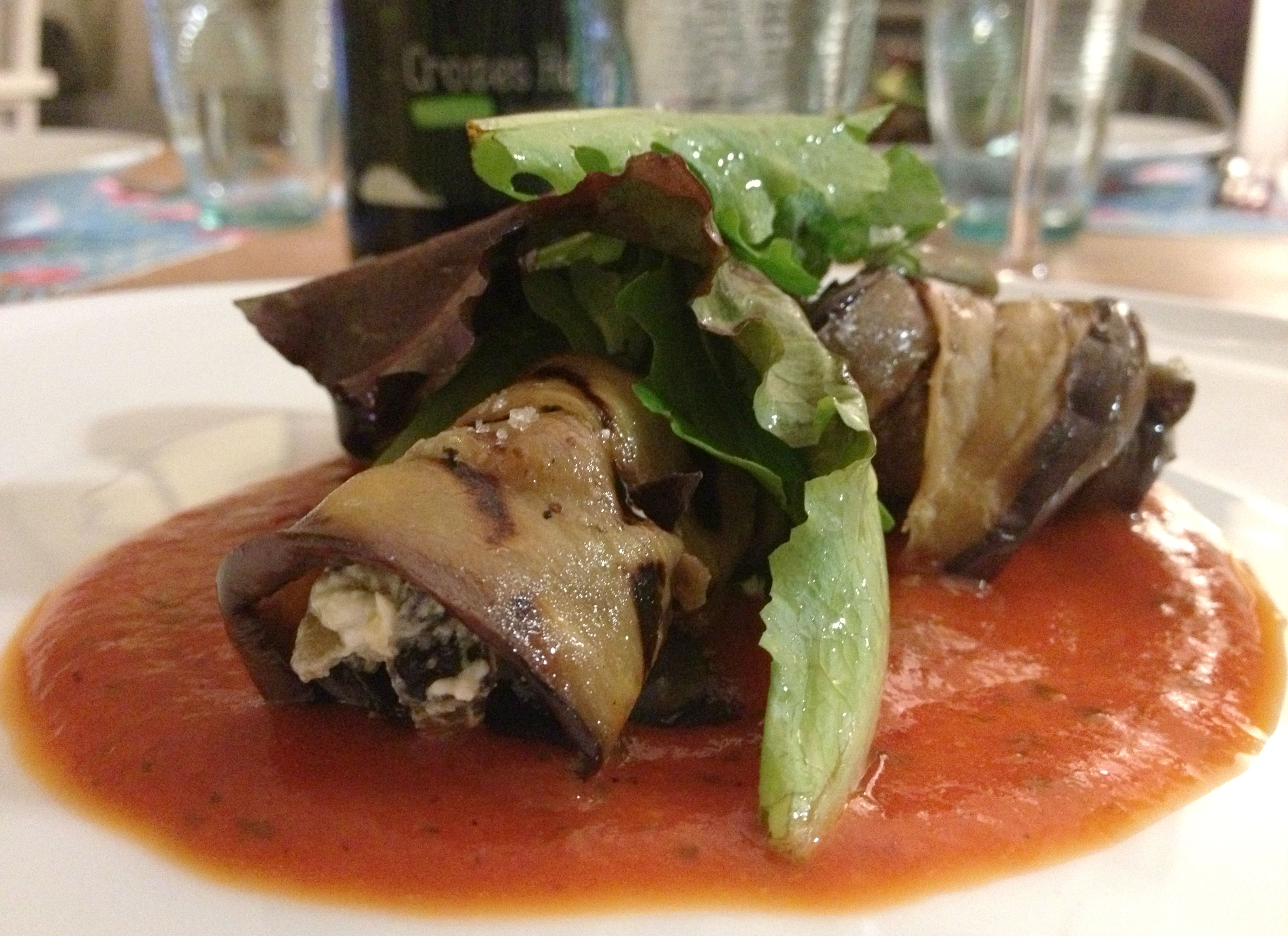 ← Roulés d’aubergines à la ricotta, olives noires, menthe et coulis de poivrons