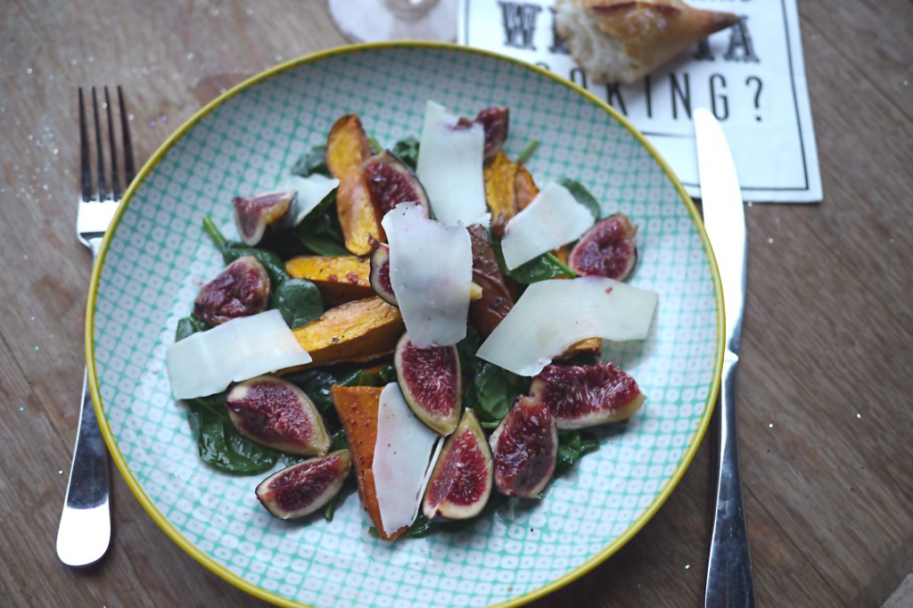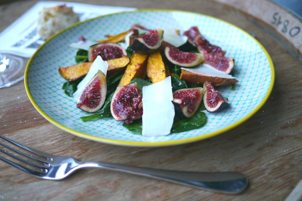 Placez les pousses d’épinards au fond de l’assiette, ajoutez les patates douce et les figues puis les lamelles de fromage. Pour terminer, un trait de vinaigre balsamique.