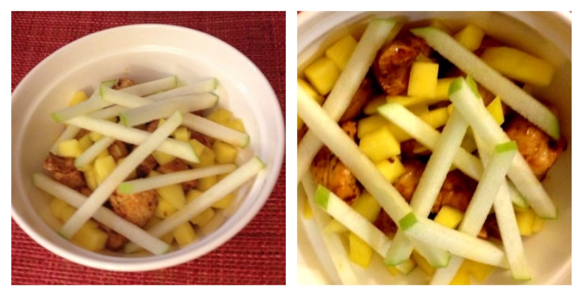 Placez votre poulet froid au centre puis ajoutez 2 cs de brunoise de mangue et finissez par quelques bâtonnets de granny smith.
