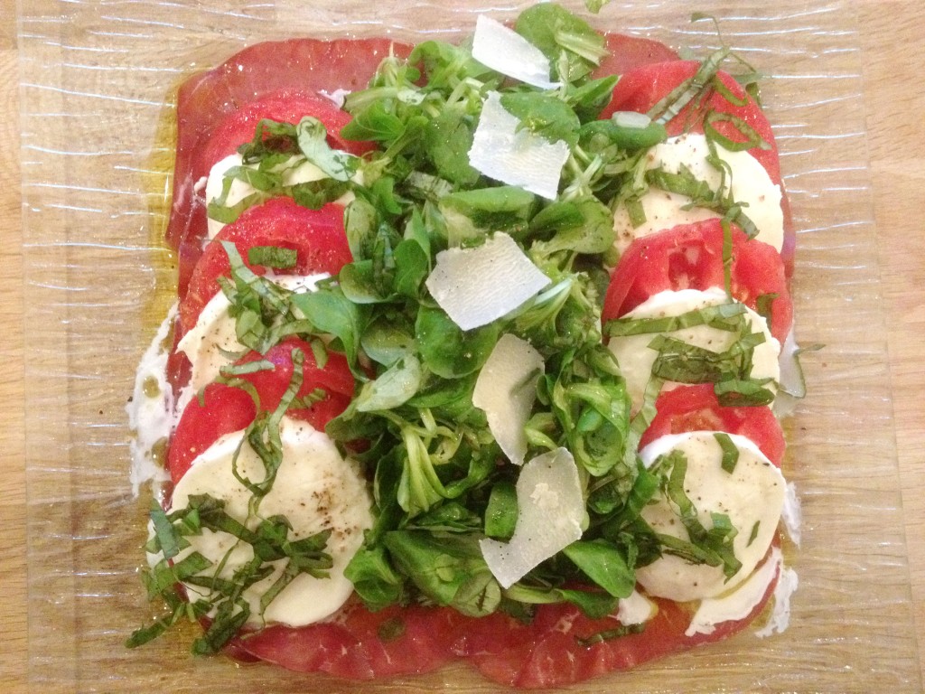 Disposer les feuilles de basilic (ou un peu de Pesto) sur les tomates et la mozzarella.