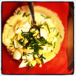Ajoutez les œufs coupés en morceaux et la ciboulette.