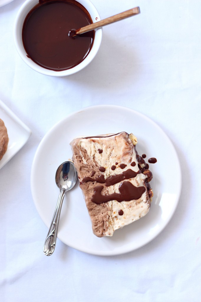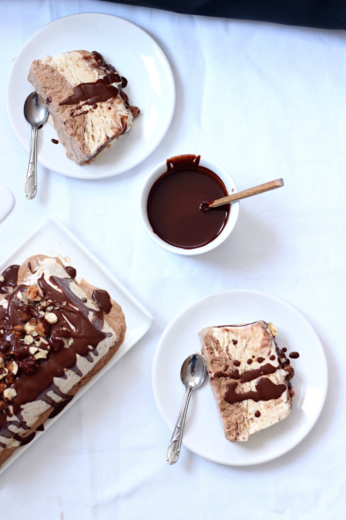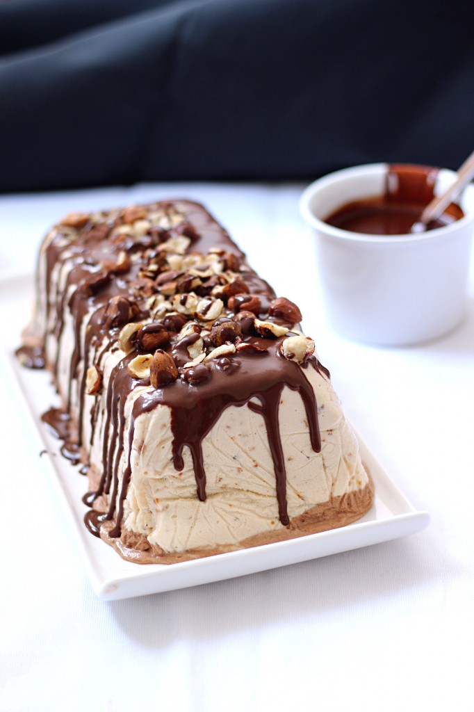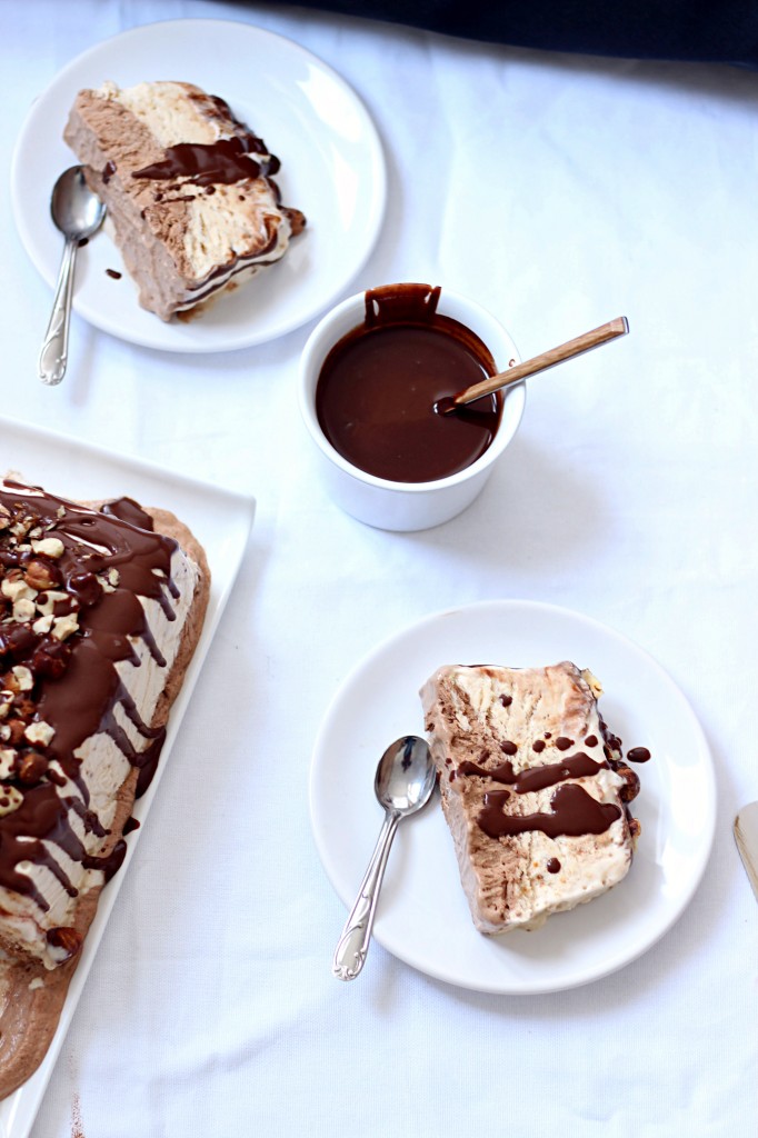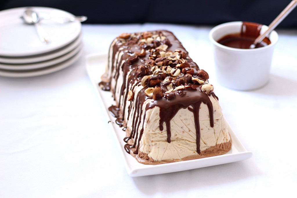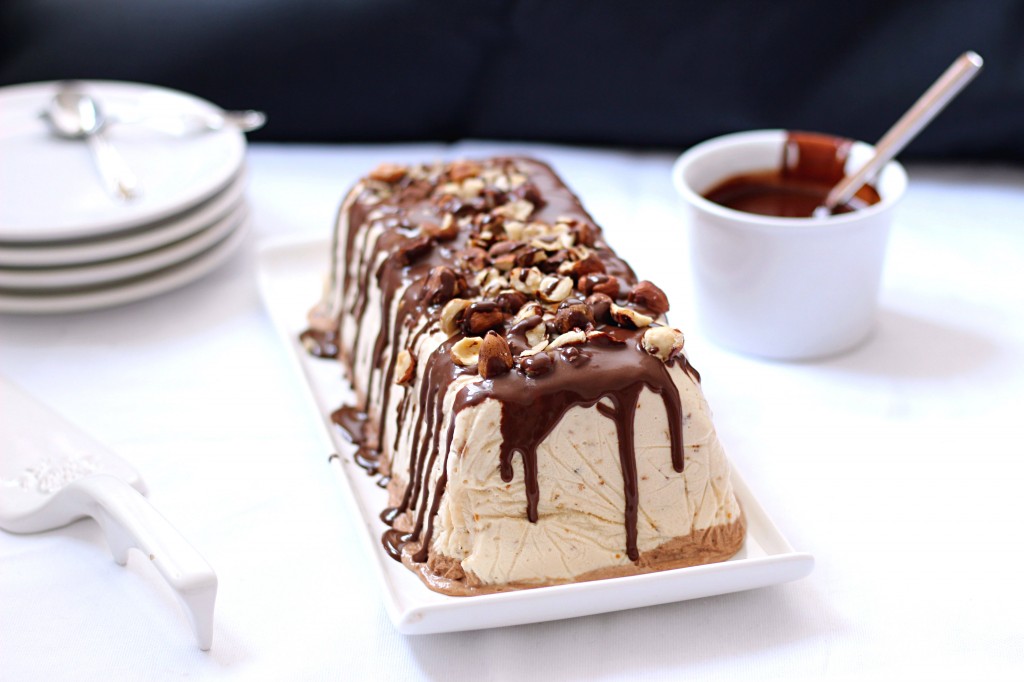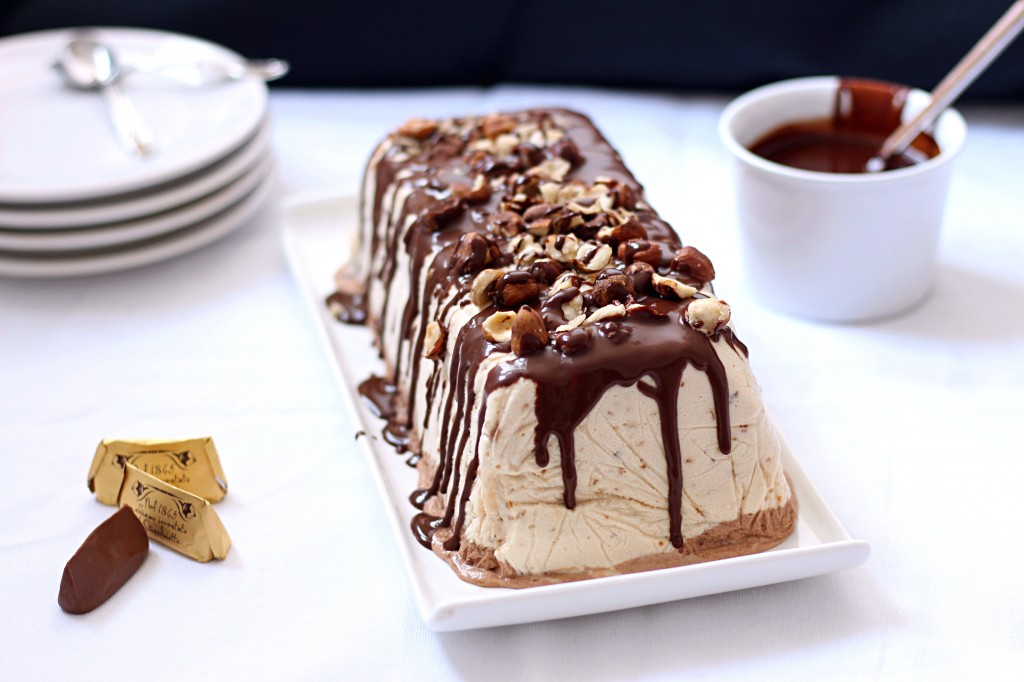 Démouler le semifreddo sur un plat de service et verser généreusement la sauce chocolat – gianduja sur le dessus.