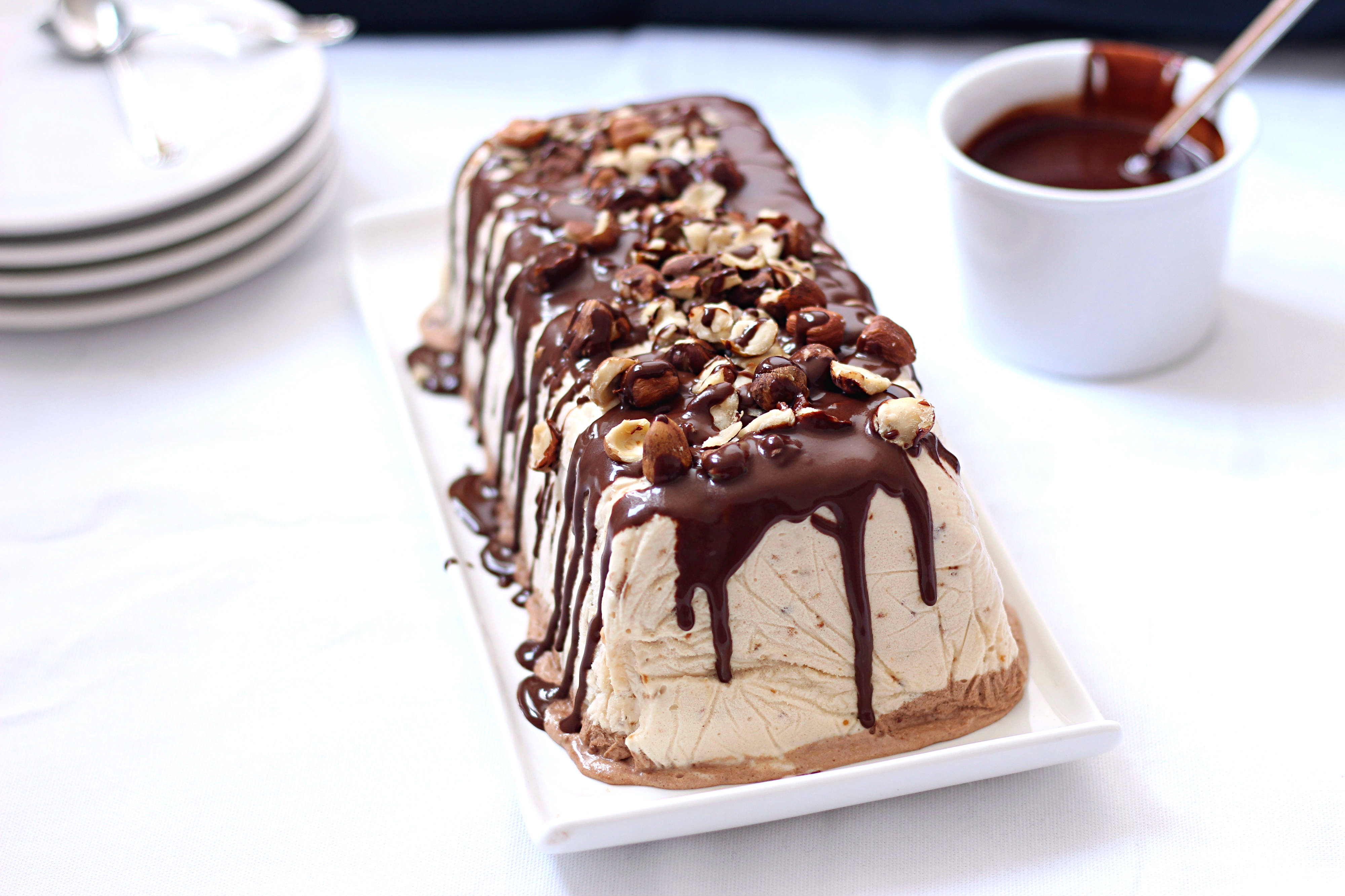 ← Semifreddo au pralin et au chocolat, sauce chocolat noir/gianduja