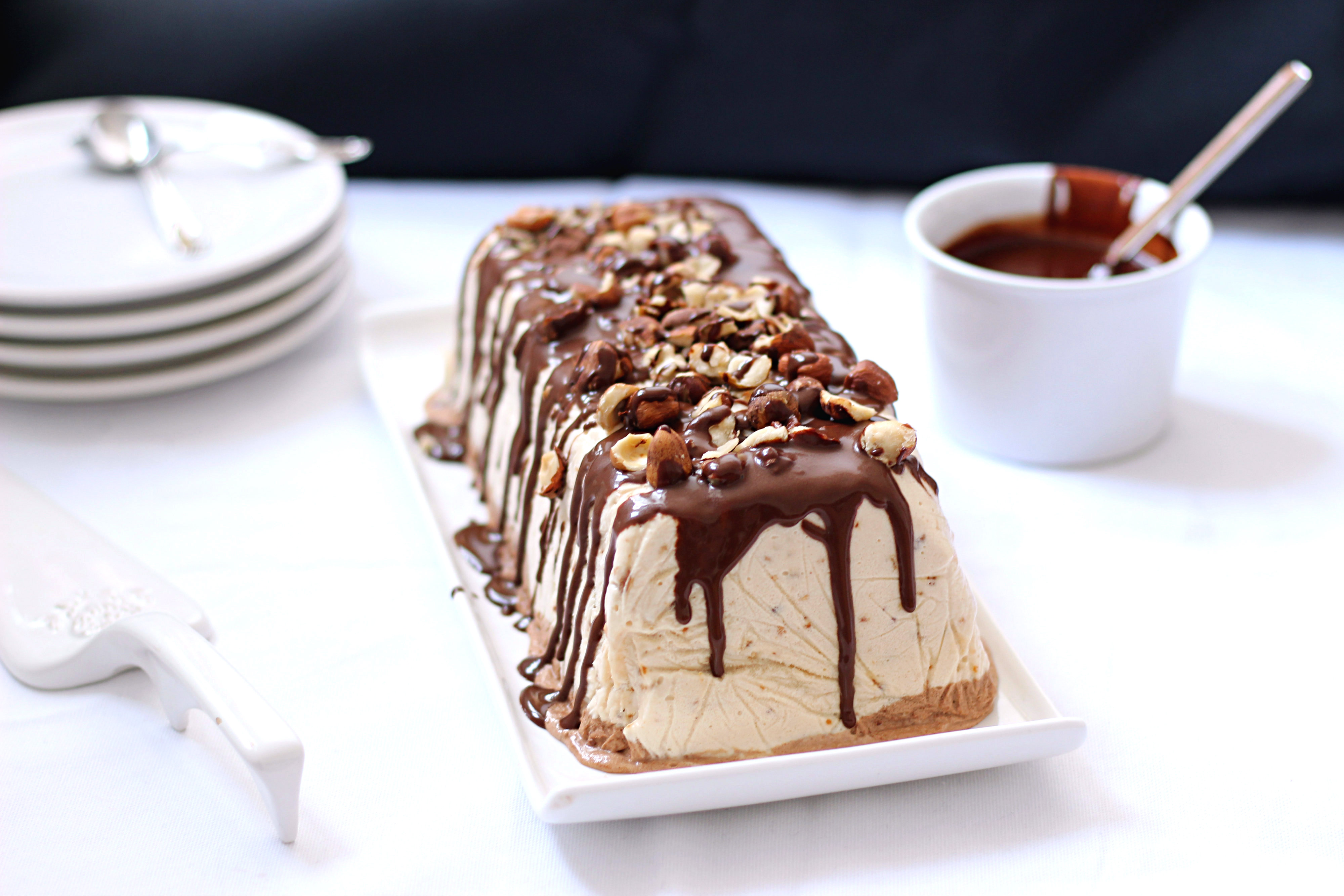← Semifreddo au pralin et au chocolat, sauce chocolat noir/gianduja