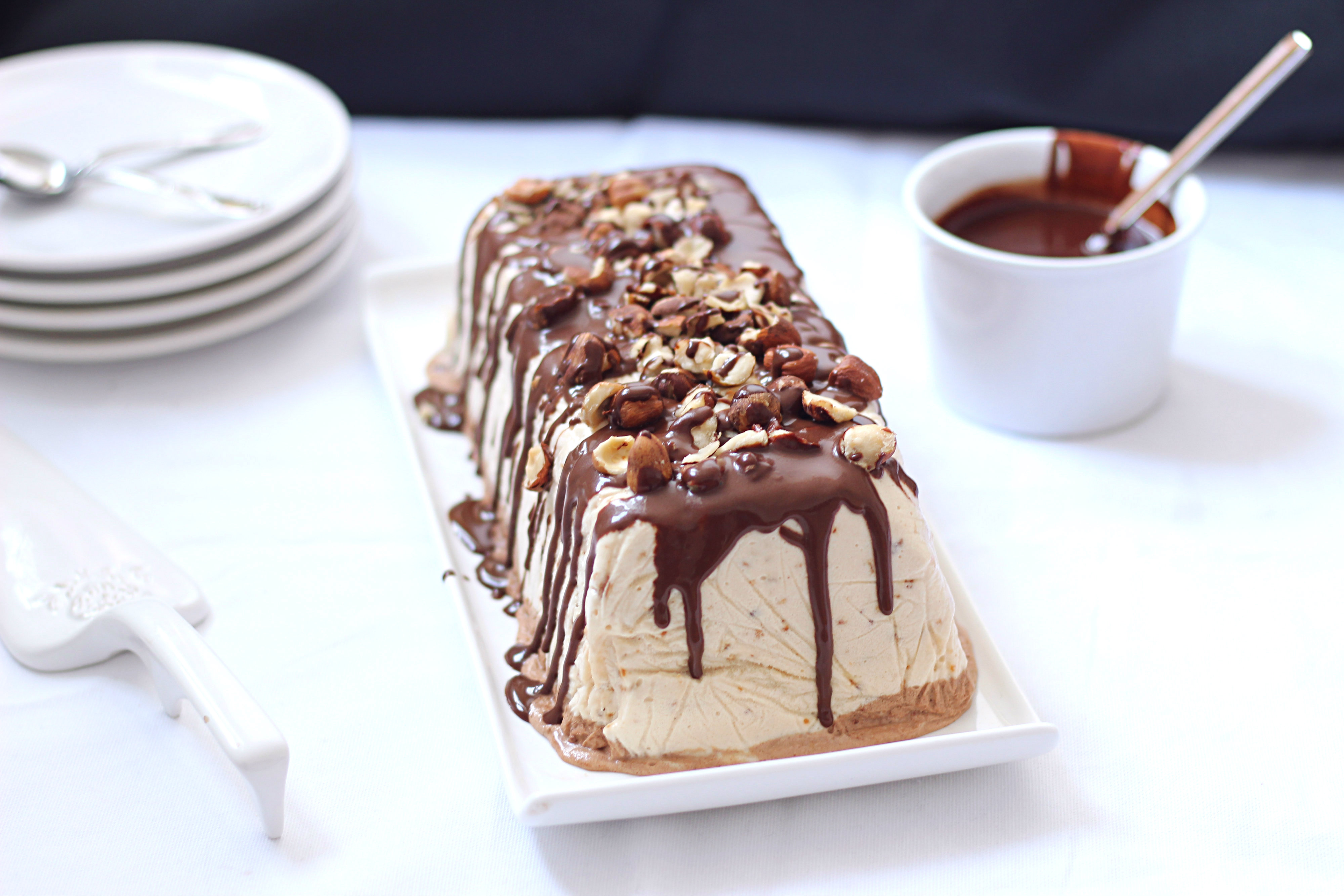 ← Semifreddo au pralin et au chocolat, sauce chocolat noir/gianduja