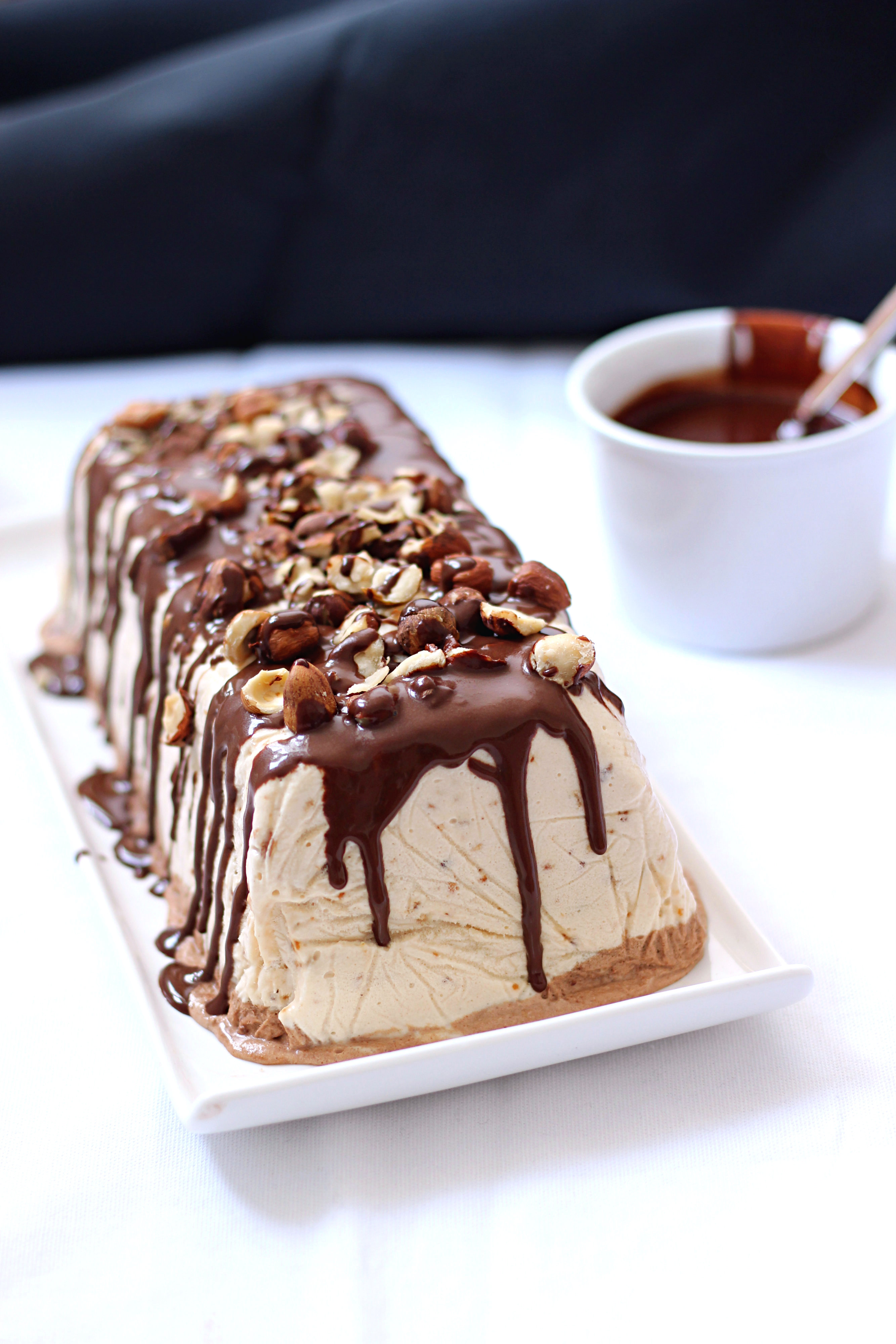 ← Semifreddo au pralin et au chocolat, sauce chocolat noir/gianduja
