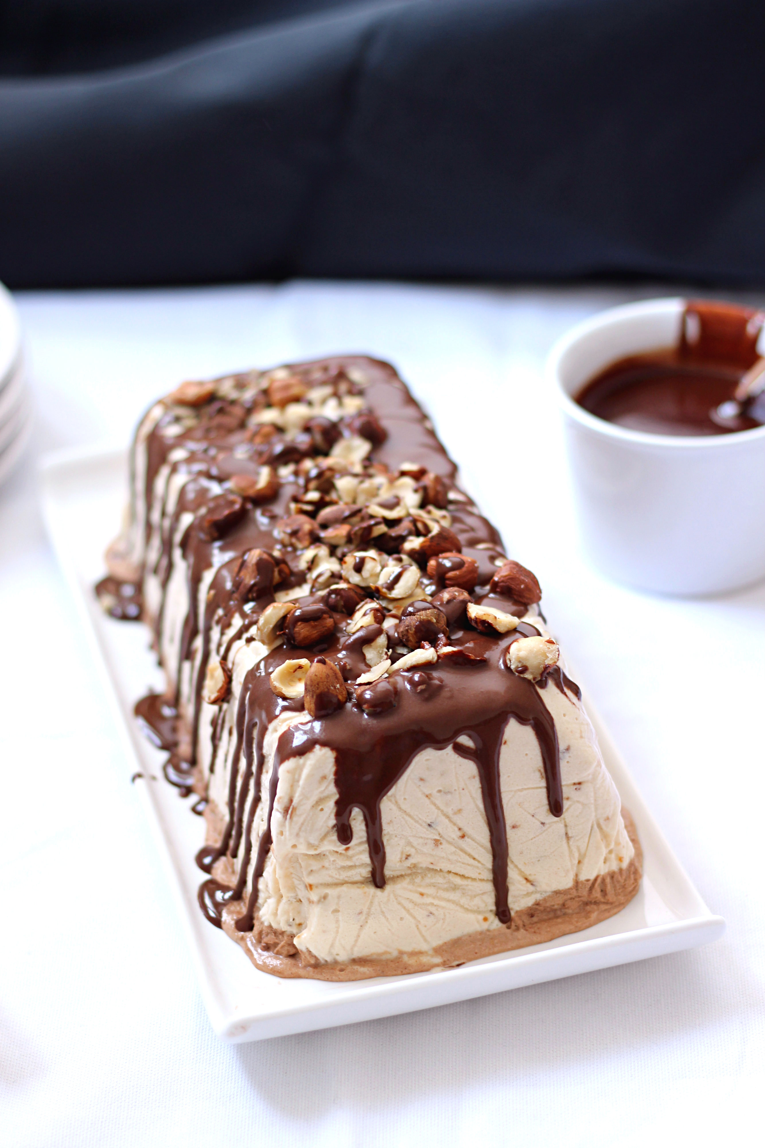← Semifreddo au pralin et au chocolat, sauce chocolat noir/gianduja
