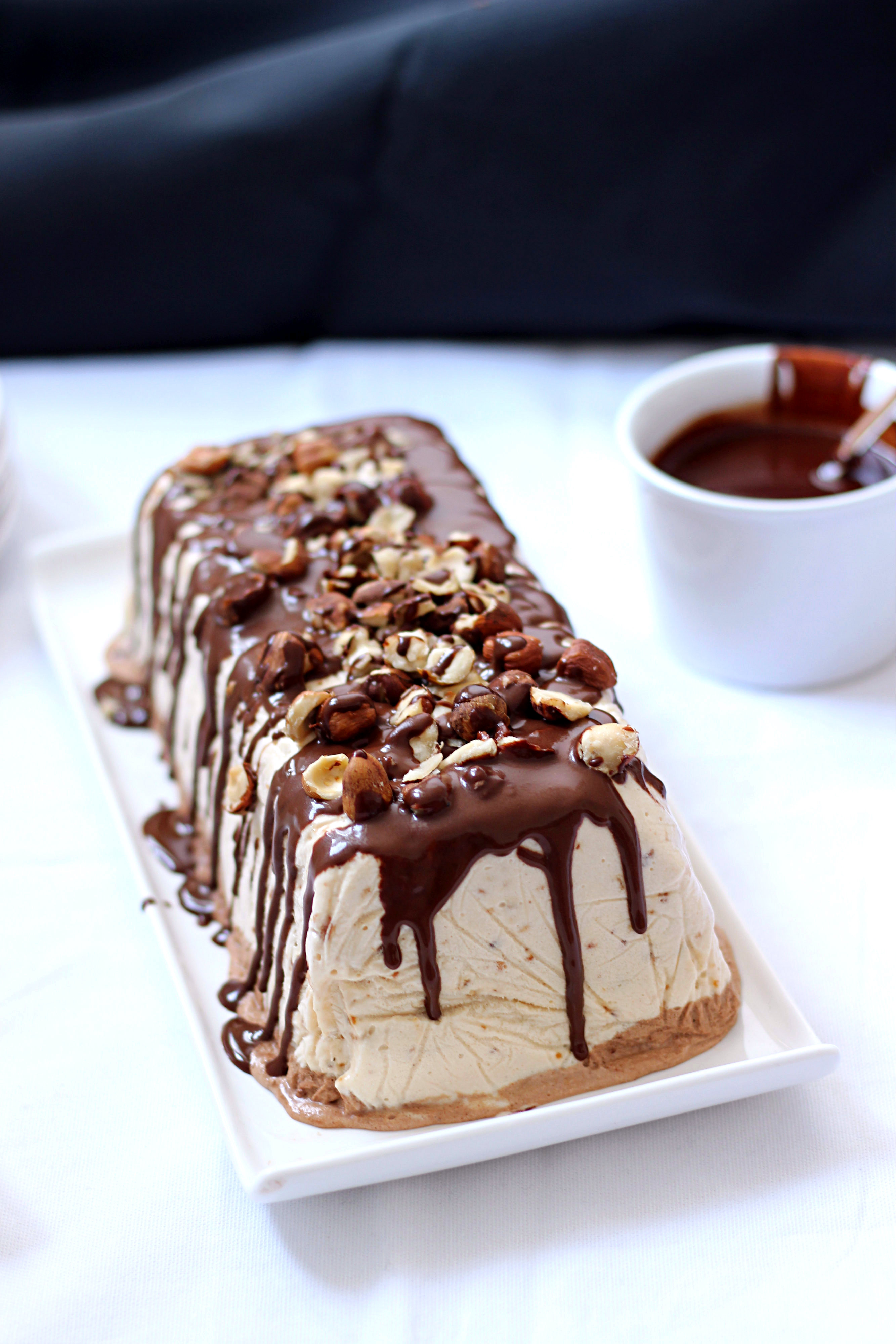 ← Semifreddo au pralin et au chocolat, sauce chocolat noir/gianduja