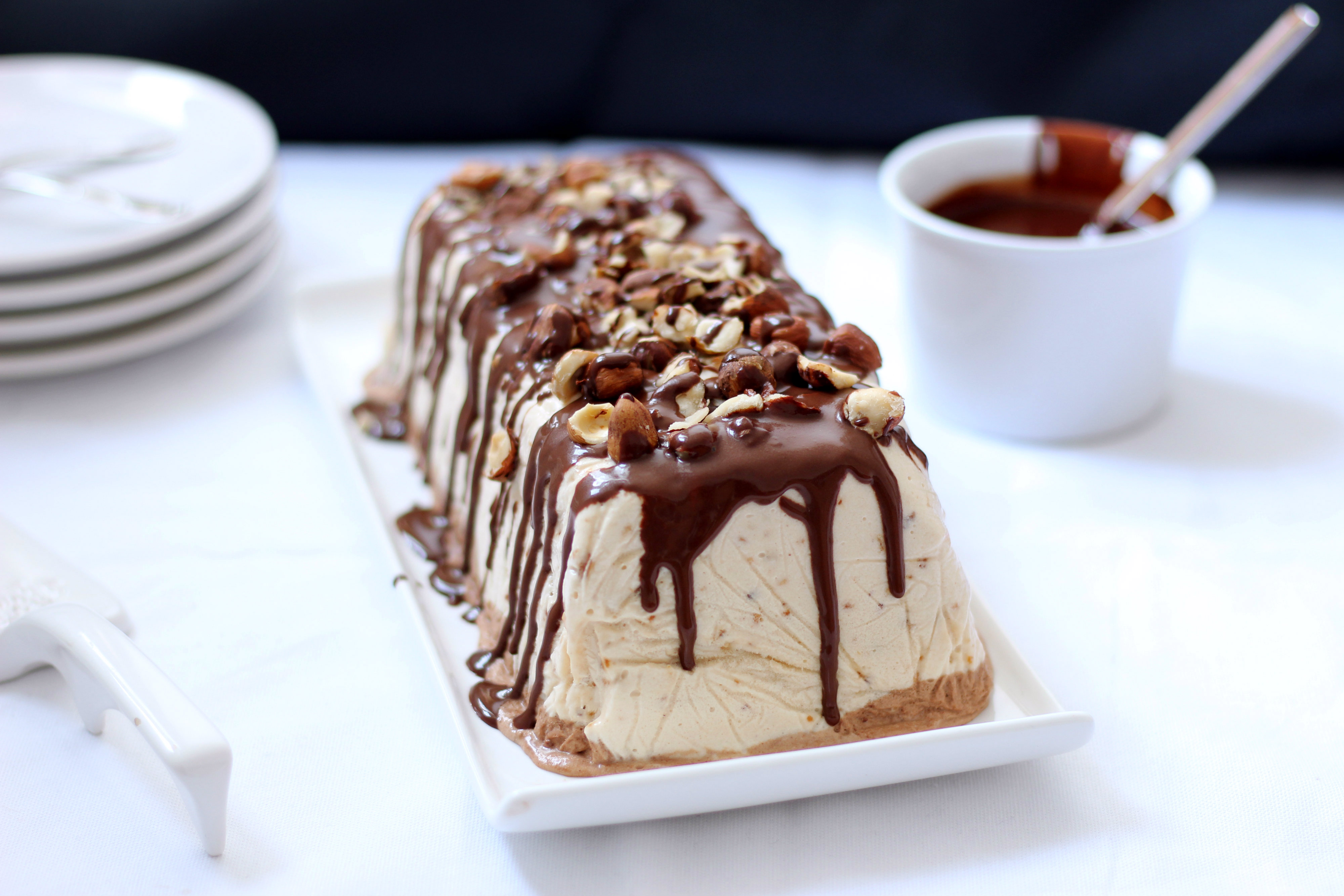 ← Semifreddo au pralin et au chocolat, sauce chocolat noir/gianduja