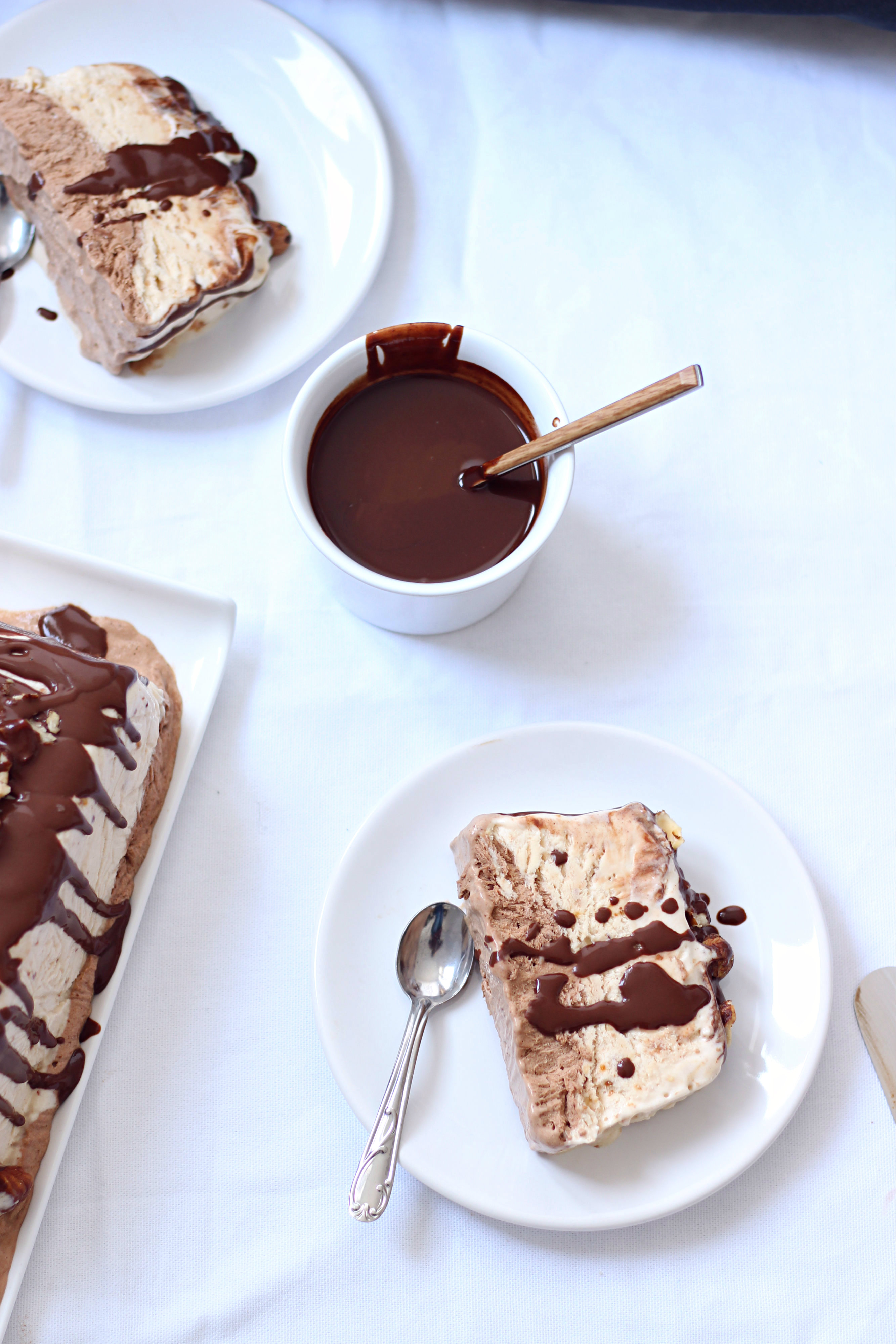 ← Semifreddo au pralin et au chocolat, sauce chocolat noir/gianduja