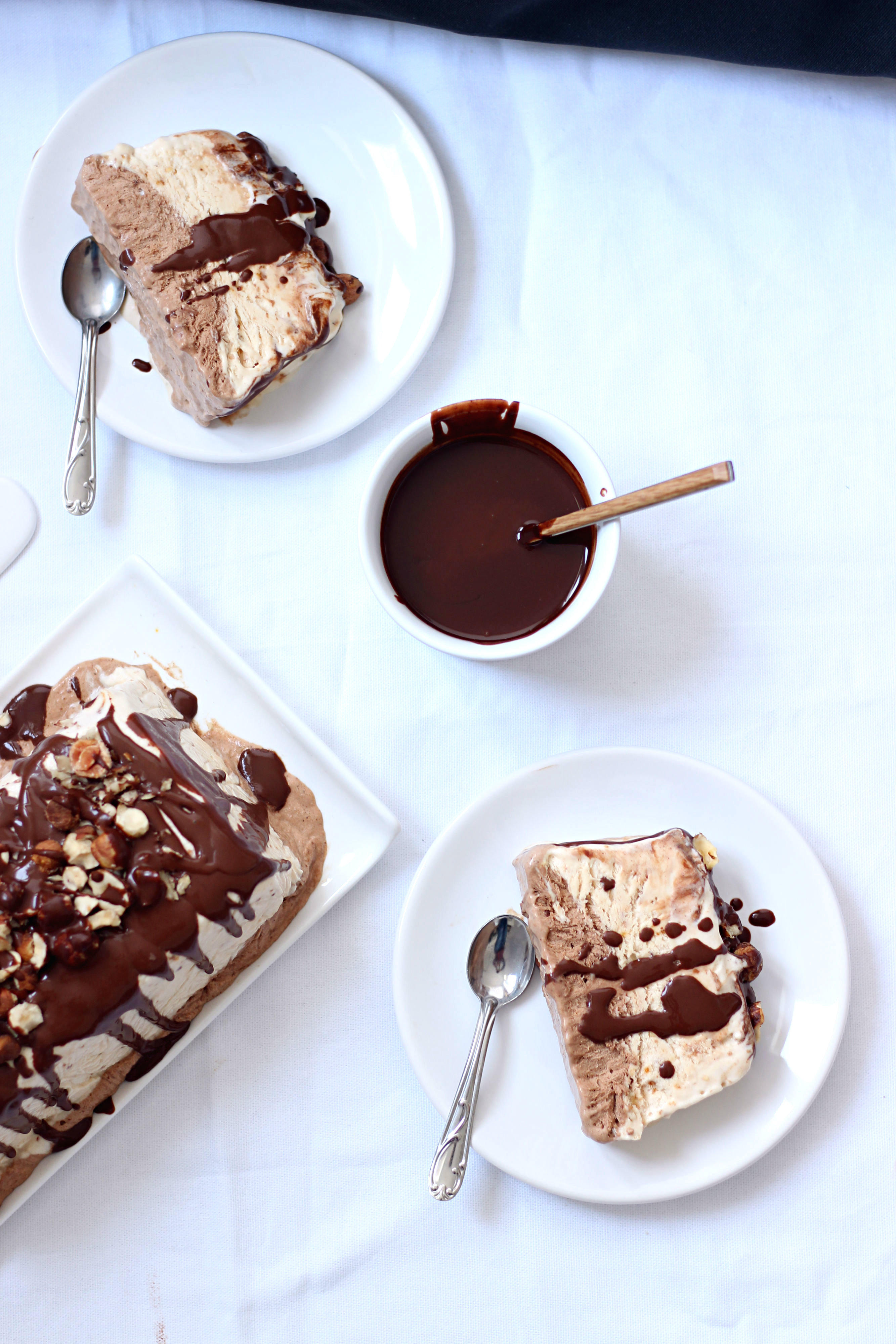 ← Semifreddo au pralin et au chocolat, sauce chocolat noir/gianduja