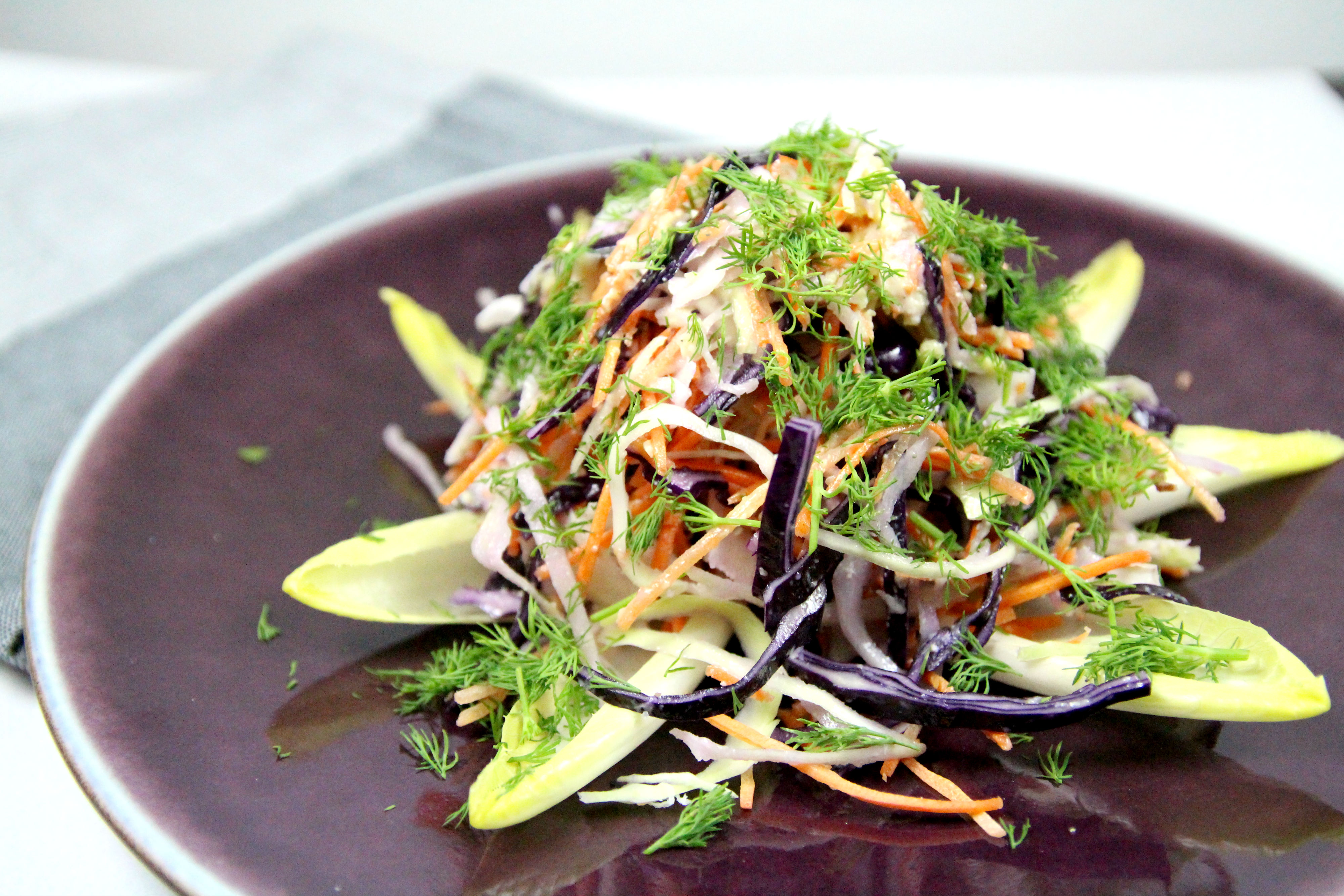 Dans un saladier mettez l’ensemble de vos légumes (céleri, chou blanc, chou rouge, carottes), la pomme, les raisins, l’oignon nouveau, et l’aneth. Ajoutez petit à petit la sauce et remuez le tout. Goûtez et rectifiez l’assaisonnement si besoin est. Attention à ne pas mettre trop de sauce afin de conservez le goût des ingrédients!