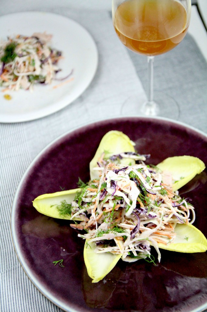 Dans votre assiette de service, disposez quelques feuilles d’endives et la salade par dessus. Parsemez encore d’aneth fraîche. Dégustez!