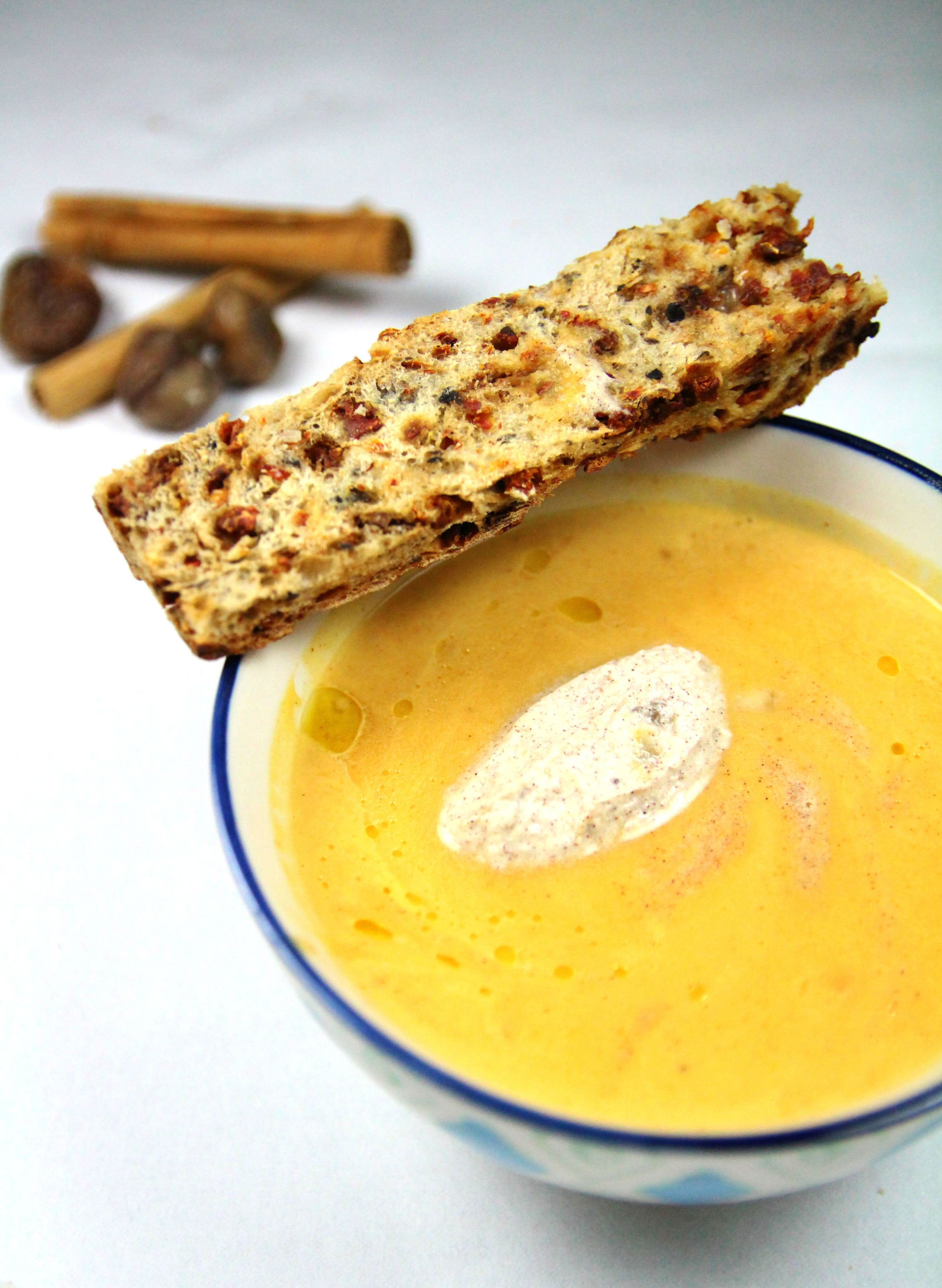 ← Soupe de courge aux éclats de marrons et sa quenelle de crème fouettée à la canelle