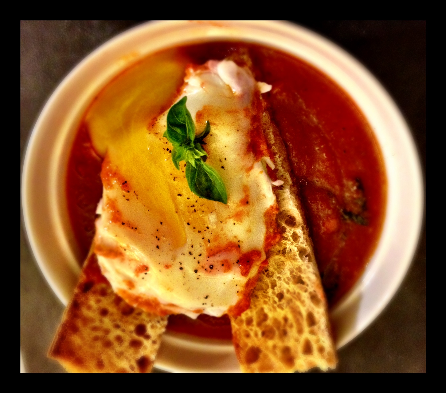 Jetez le basilic dans la soupe et poivrez généreusement. Mélangez et versez la préparation dans vos récipients. Mettrez un trait d’huile d’olive, placez la tranche de pain sur la soupe puis l’œuf poché. Ajoutez de la fleur de sel et un tour de moulin à poivre.