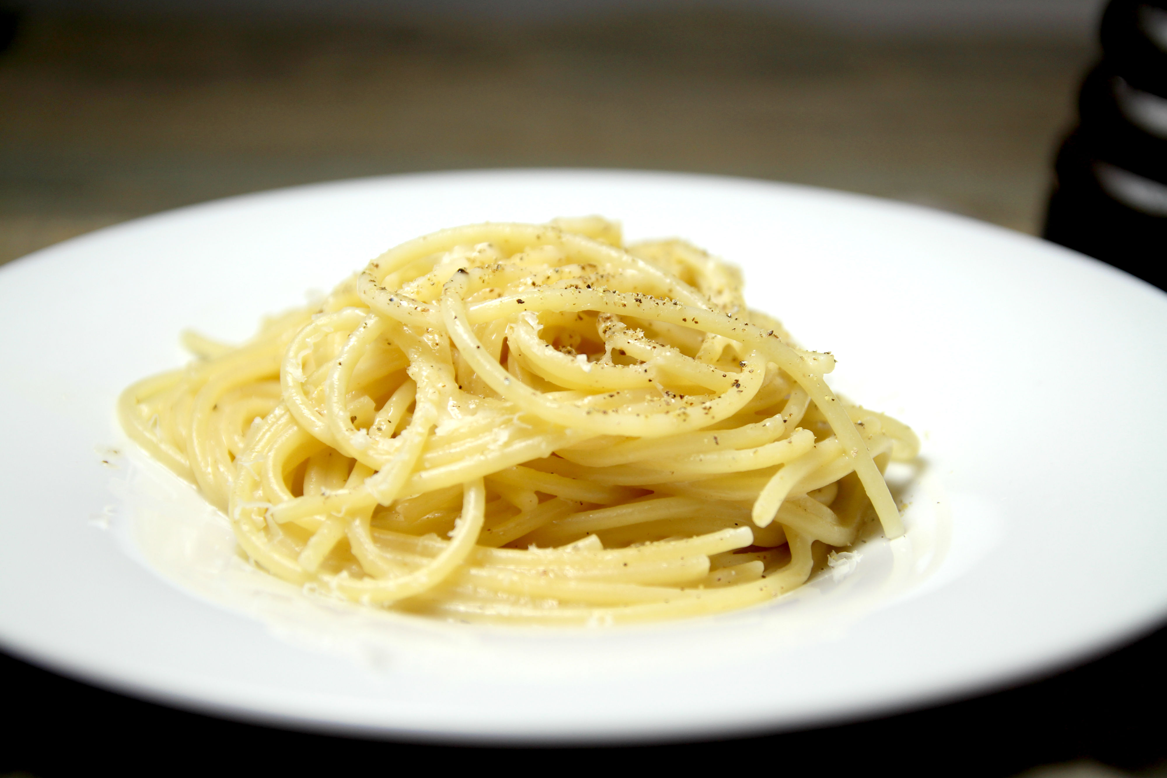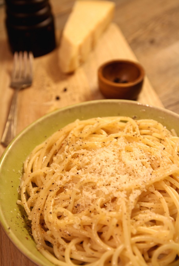 Aujourd’hui direction l’Italie avec une recette de pâtes dont je raffole, les spaghetti cacio e pepe. Il s’agit de faire revenir les pâtes avec du pecorino et du poivre et un peu d’eau de cuisson des pâtes ce qui va permette d’avoir une texture crémeuse…yummy yummy. Comme dans beaucoup de recettes, chacun possède sa façon de faire, j’ai choisi celle qui marche pour moi. En effet, certains font le mélange fromage, poivre, eau de cuisson avant et à froid d’autres, le font dans l’assiette au moment de servir…bref libre à vous de tester ce qui convient le mieux. Egalement pour le choix des pâtes j’ai choisi des spaghetti mais là également libre à vous d’utiliser des tonnarelli ou autres…Une chose est sûre c’est que vous ne pourrez plus vous passer de cette recette.