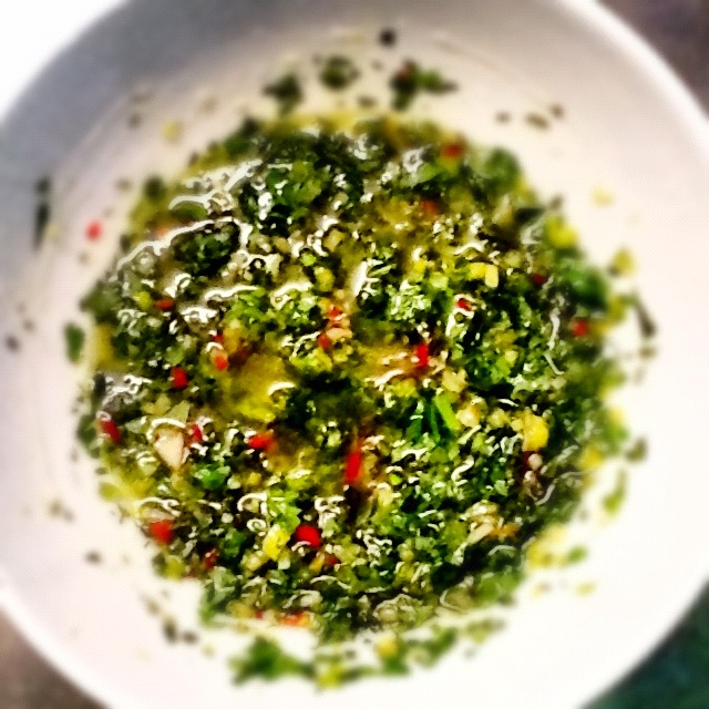 Aujourd’hui je vous présente une recette simple et goûteuse de viande. Ce qui est bien c’est que vous pouvez faire la « salsa verde » à l’avance et donc le moment venu de passer à table vous n’avez plus qu’à griller votre viande et préparer l’accompagnement. Pour ce qui est de la viande, prenez votre morceau préféré, pour ma part j’ai acheté une belle entrecôte rassis sur l’os, mais on aurait pu faire cela avec de la bavette, du filet…Vous pouvez utiliser également cette sauce sur un poisson, des crevettes, des salades…Etant donné que la salsa joue un rôle important n’oubliez pas de la goûter pendant la préparation pour l’adapter à votre goût (plus acide, épicée…). Il est important qu’elle ait du caractère pour apporter de la fraîcheur à votre plat donc essayez de trouver le bon équilibre.