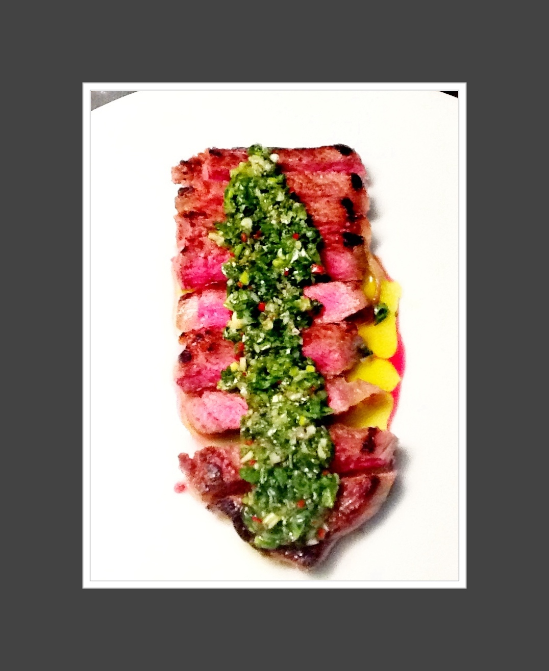 7. Finissez en versant de la salsa verde sur les steaks et en ajoutant quelques feuilles de coriandre et de menthe que nous avions gardées. Versez également le jus que les steaks ont recraché pendant leur repos.