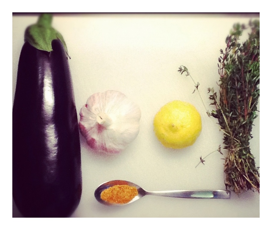 Laver les aubergines et couper le pédoncule. Réserver 1 gousse d’ail, couper les gousses en deux et en piquer les aubergines. Disposer les aubergines sur une plaque, les badigeonner avec 10 cl d’huile d’olive. Saupoudrez de feuilles de thym. Cuire 1 heure environ dans un four à 160°C. Couper les aubergines en deux dans la longueur et récupérer la pulpe. La dessécher à feu doux dans une casserole en fouettant vivement. Ajouter le curry, la fleur de thym, la gousse d’ail réservée (finement hachée) et le jus de citron. Faire cuire pour obtenir une pulpe homogène. Incorporer le reste d’huile d’olive. Saler et poivrer.