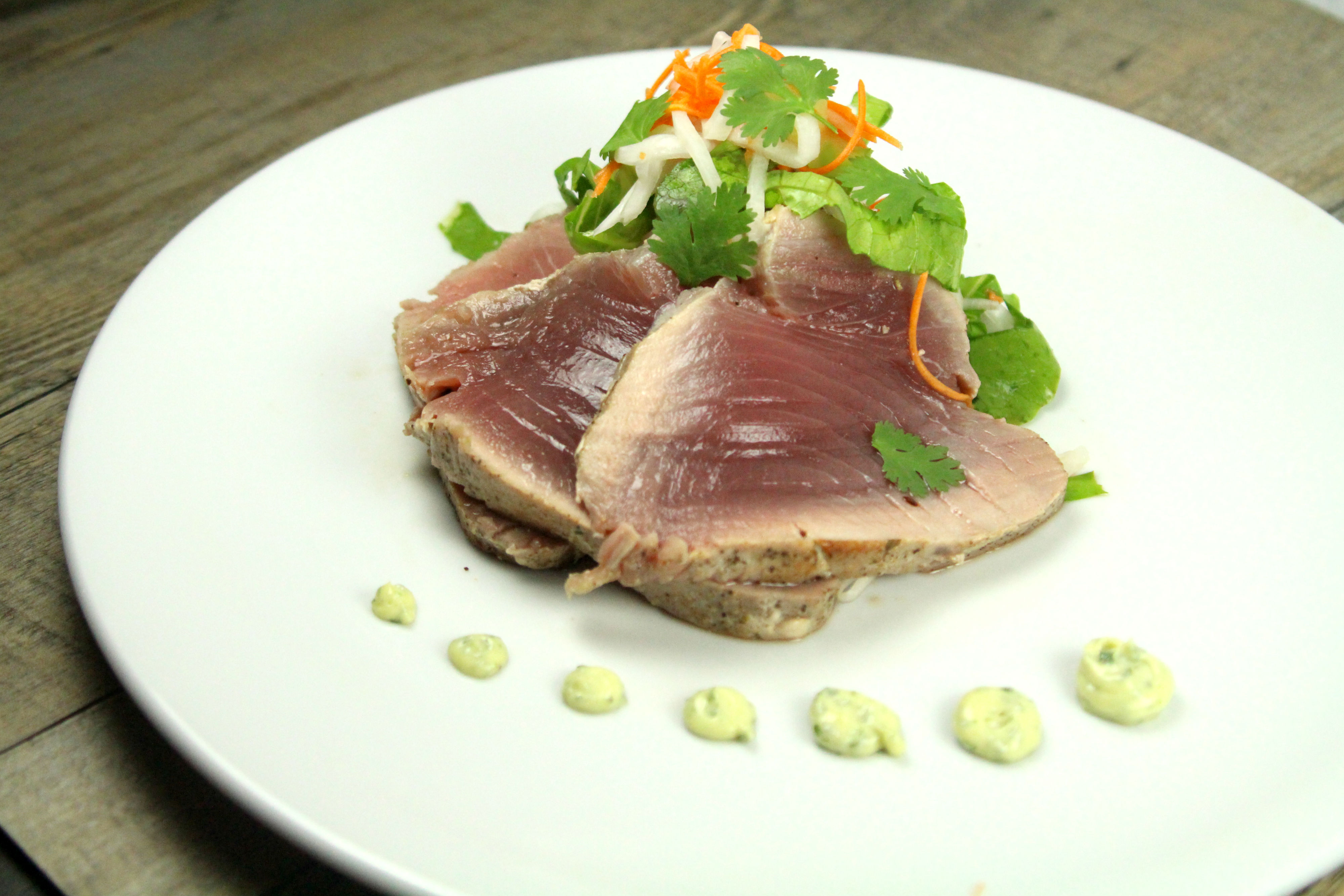 ← Thon mi-cuit, mayonnaise à la coriandre et salade aigre-douce