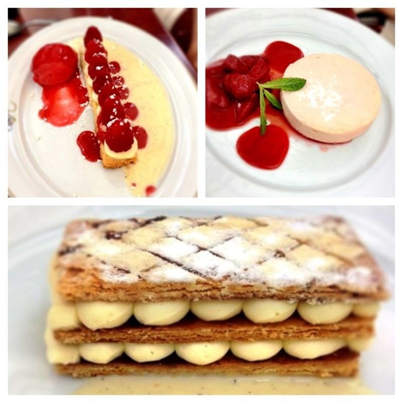 A la vue du menu du jour, mon choix s’est vite porté sur des filets d’anchois frais de méditerranée marinés. Il est plutôt rare d’avoir ce type de plat à la carte d’un restaurant. Les anchois avaient juste l’assaisonnement qu’il fallait (ail et huile d’olive) et les filets étaient charnus à souhait. Cette entrée, aussi simple qu’elle eut été fut un vrai enchantement. A mon sens, toute la gastronomie était présente : un super produit traité avec le plus grand respect. Le plat : un thon snacké et macaronade était bien réalisé mais ne m’a pas vraiment touché. La carte proposait plusieurs douceurs à base de fraises de Carros très tentantes, mais mon gros penchant pour la crème pâtissière a fait pencher mon choix vers le Millefeuille de tradition caramélisé. Ce fut à la hauteur de l’entrée. Les strates de pâte feuilletée étaient recouvertes de fines pellicules de caramel (probablement une couche de sucre saupoudrée avant la cuisson). La texture et la saveur de la pâtissière étaient parfaites. Une crème anglaise et une boule de glace vanille (présentée à part) venaient compléter ce plat. Petit bémol, la crème anglaise n’apportait pas grand chose mais pour autant était à la hauteur du reste. Il n’y avait rien de mieux que ce sublime dessert pour clore ce repas.