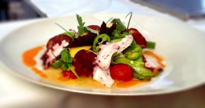 Pour finir Christian Morisset, en compagnie de ses deux fils, confectionna un « Risotto de fregola sarda à la crème d’artichauts aux poulpes marinés, poivrons et courgettes, jus de légumes provençaux au chorizo iberico bellota joselito et huile d’olive vierge de geraci aux feuilles de basilic frais » très méditerranéen.