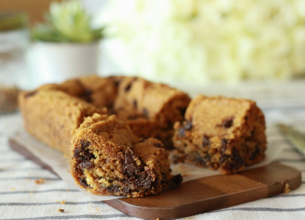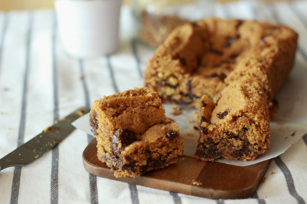 J’ai très légèrement modifié la recette d’origine et j’ai agrémenté ce « blondies » de pépites de chocolat noir et de pralin.. Autant vous dire qu’on est du côté obscur de la graisse force!