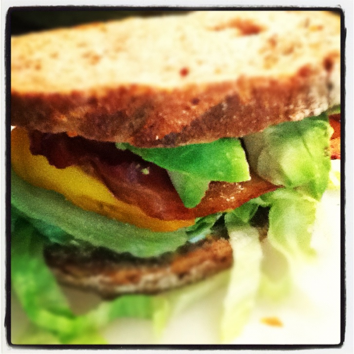 Disposez successivement sur votre pain la salade, les tranches de tomates (que je poivre légèrement), l’avocat, le bacon, et terminez par une autre feuille de laitue.