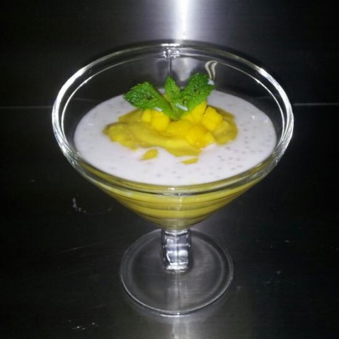 Je vous conseille le délice à la mangue en dessert, des perles du Japon (Tapioca) avec du coco et un coulis de mangue.