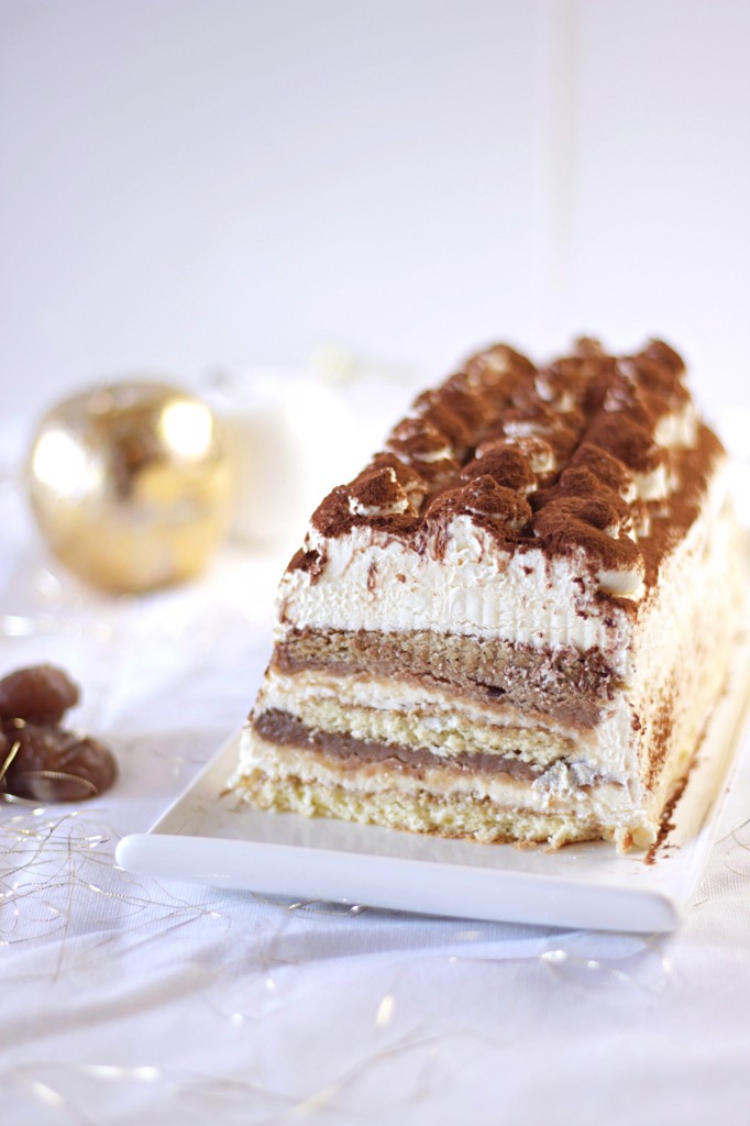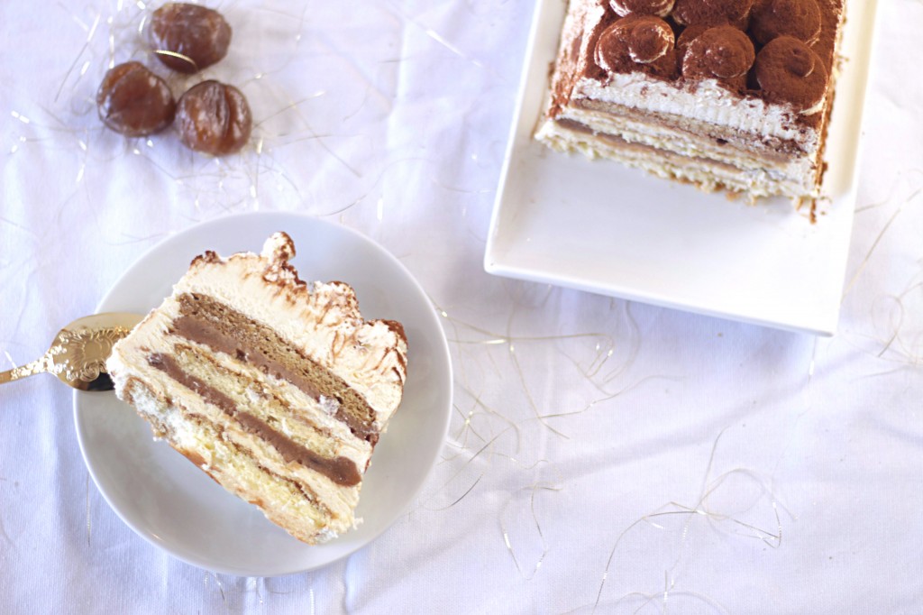 J’ai longuement hésité (trèèèèèès longuement) entre réaliser un appareil à tiramisu à la crème de marrons, ou faire un appareil classique avec des couches de crème de marrons.