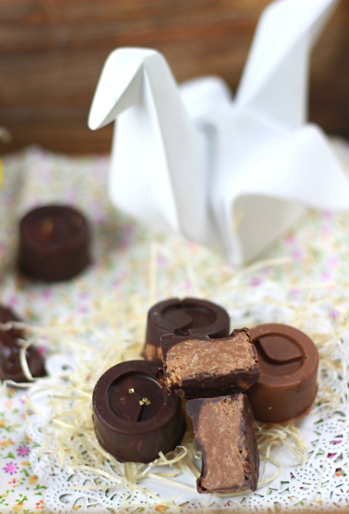 - des chocolats noirs et au lait façon « Shokobons » garnis de chocolat blanc praliné : j’ai mélangé du chocolat blanc Ivoire de Valrhona avec du pralin.