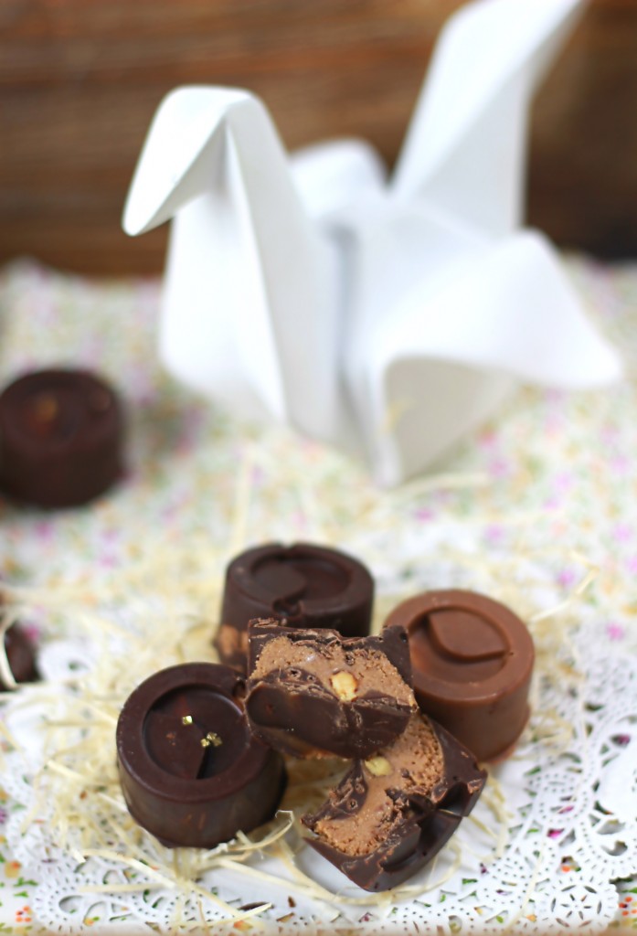 - des chocolats noir et au lait garnis de gianduja noisettes: j’ai versé du gianduja maison liquide à l’intérieur de mes coques de chocolat et inséré une noisette entière au centre avant de recouvrir.