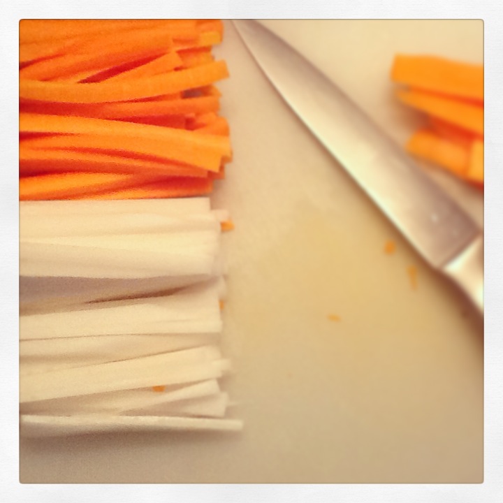 Epluchez les carottes et le daikon. Coupez des tronçons de 5 cm puis taillez les légumes en bâtonnets. Ma tachnique c’est de d’abord couper de chaque côté du légume une fine lamelle afin d’avoir un bord plat. Cela permet au légume d’être plus stable sur votre planche et ça donne une régularité à la taille. Armez-vous d’un peu de patience et faites attention aux doigts. En plus de préparer quelque chose de délicieux vous améliorez et exercez votre talent de coupe de légume donc que du positif