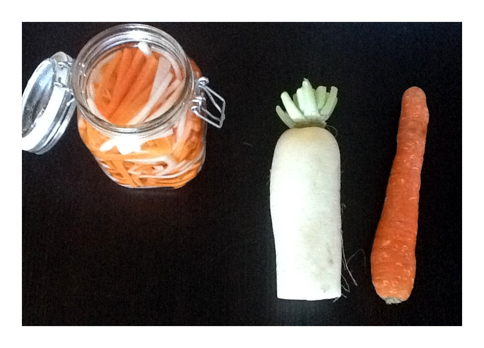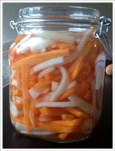 Aujourd’hui nous partons en Asie et plus précisément au Vietnam pour une recette de condiments aigre-doux tirée du livre d’Andrea Nguyen « Into the Vietnamese Kitchen ». Ce genre de condiments est très couramment utilisé dans la cuisine asiatique et personnellement je les adore. Ils peuvent être servi avec beaucoup de plats comme les salades, la viande, à côté d’une soupe, dans des sandwichs…Je les aime aussi nature quand j’ai un petit creux car ils sont croquants, doux et aigre à la fois. Vous pourrez d’ailleurs ajuster le niveau acidité selon votre goût en ajoutant plus ou moins de sucre.
