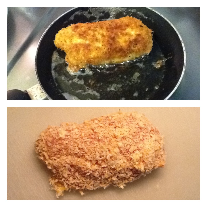 Préparez votre « panure à l’anglaise » c’est-à-dire 3 récipients, l’un avec la farine, l’autre avec l’œuf battu puis le dernier avec la chapelure que vous n’oublierez pas d’assaisonner de sel, de poivre du moulin et si vous voulez vous pouvez rajouter des épices qui trainent dans le placard et dont vous ne savez pas quoi faire. Ainsi pour changer pourquoi ne pas faire une panure au curry, au piment d’Espelette, aux herbes de Provence ou autre.