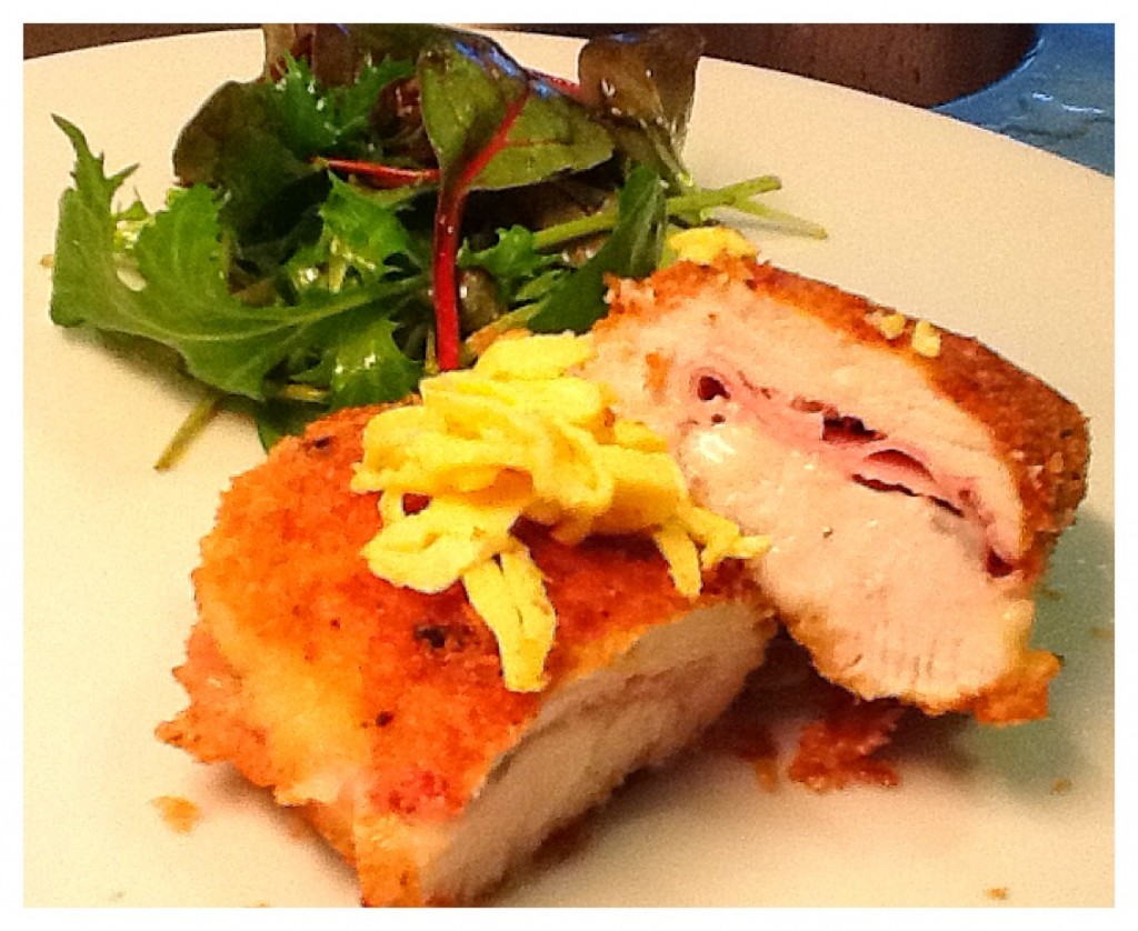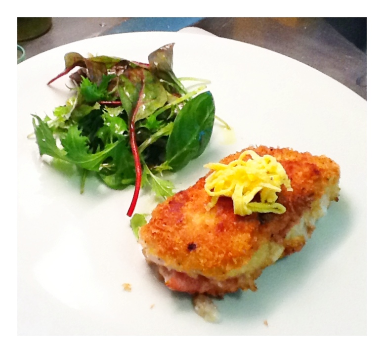 Accompagnez vos cordons bleus de ce qui vous fait plaisir, j’ai servi les miens avec de la salade mais cela aurait pu être des légumes, une purée… N’hésitez pas également à rajouter une sauce tomate maison ou un coulis de poivrons…Ah oui j’allais oublier, ce que vous voyez et qui est jaune sur le cordon bleu n’est autre que le reste d’oeuf (utilisé pour pané le cordon bleu) que j’ai cuit dans une poêle et découpé en fines lamelles…on ne jette rien!