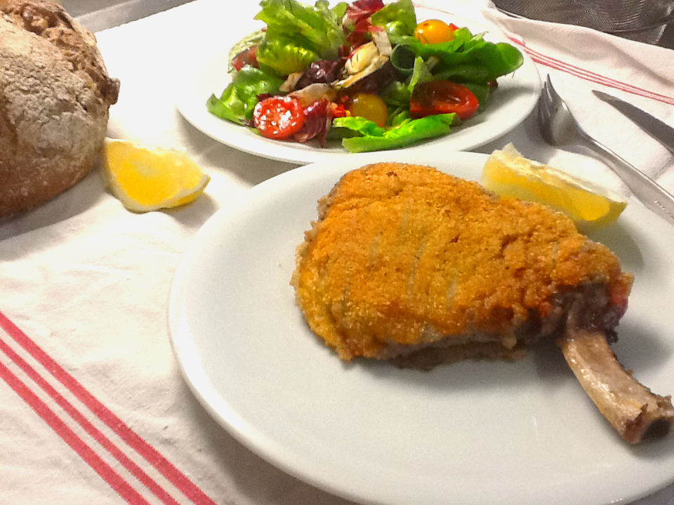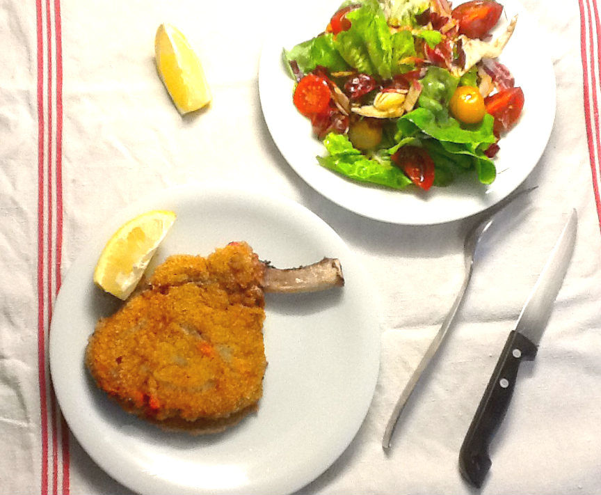 Aujourd’hui nous partons pour l’Italie avec le soleil qui refait son apparition pour cuisiner la côte de veau à la Milanese. Je me suis inspiré pour cette recette du blog très gourmand « un déjeuner de soleil« . Je vous conseille, pour cette recette, d’utiliser des côtes pas trop grosses afin d’éviter d’avoir quelque chose de trop lourd et donc écoeurant. J’ai servi ces côtes avec une salade de laitue, radicchio et tomates mais libre à vous de les accompagner d’un bon risotto, de légumes grillés ou autre. Assez parlé, place à la recette.