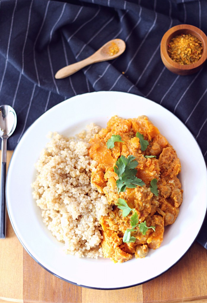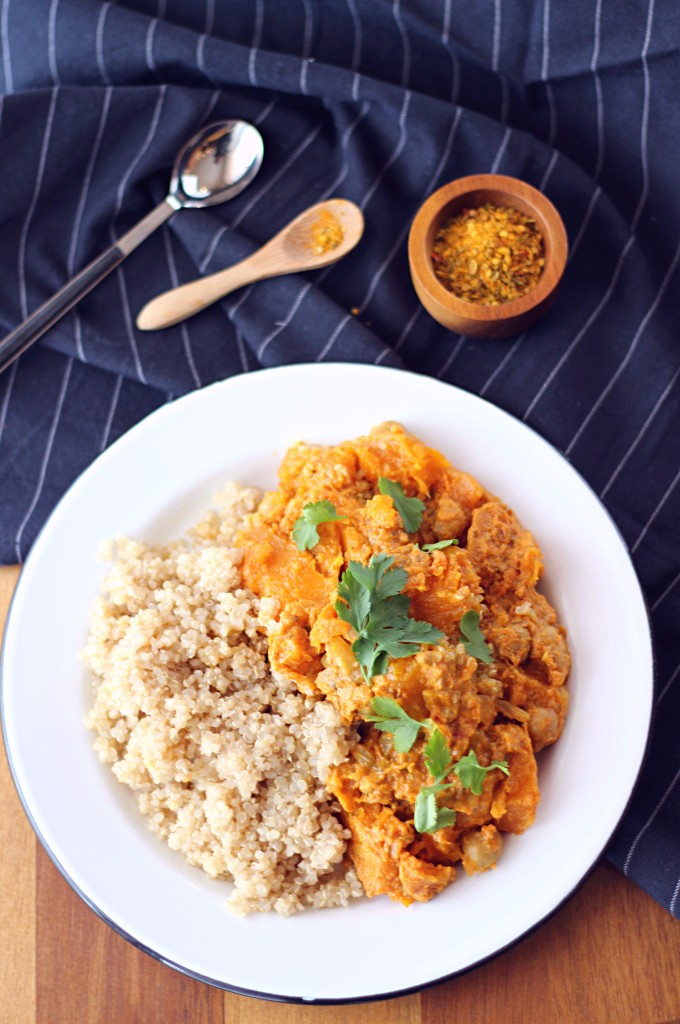 Pour tout vous dire, c’est la première fois que je réalisais un curry végétarien puisque d’habitude, je le fais avec du poulet! Sauf que là je me suis retrouvée avec une subite et irrépressible envie de curry (je ne suis pas enceinte je précise) mais pas de poulet dans mes victuailles! Qu’à cela ne tienne, j’avais une belle butternut qui n’attendez qu’à être découpée et cuisinée!!