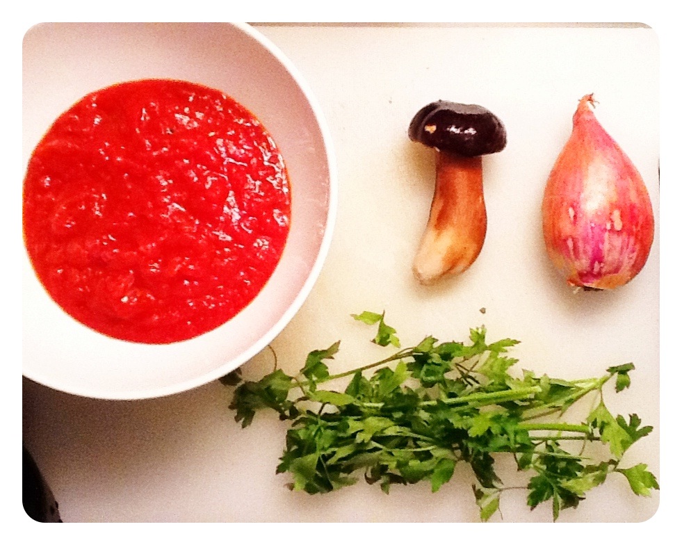 Nettoyer les champignons avec un chiffon ou un pinceau humide puis les couper en morceaux. Ciselez finement votre échalote. Faites revenir les champignons à feu vif dans une poêle dans 10 g de beurre jusqu’à évaporation de leur eau de végétation. A mi cuisson ajoutez votre échalote. Une fois que votre échalote et vos champignons sont cuits ajoutez le persil plat et versez le tout dans votre sauce tomate. Rectifiez l’assaisonnement si besoin est et faites mijotez le tout pendant que vous terminez vos autres préparations.