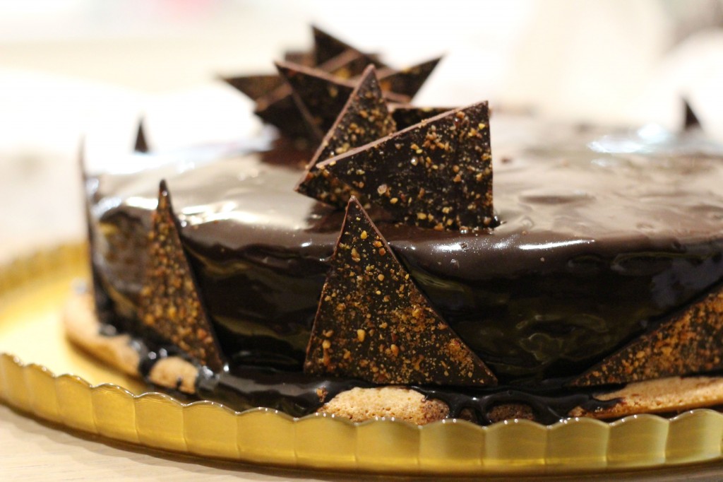 Revenons au chocolat, et à ce dessert qui a clôturé cette année 2014. J’avais envie cette année d’affronter l’épreuve du glaçage miroir que je n’avais pas encore réalisé; c’est maintenant chose faite et plus ou moins réussie. Je n’avais, en réalité, pas fait assez de nappage, ce qui fait que j’ai du finir de l’étaler à la spatule, ce qu’il ne faut naturellement pas faire! Bref, il suffira juste de multiplier les doses du glaçage!