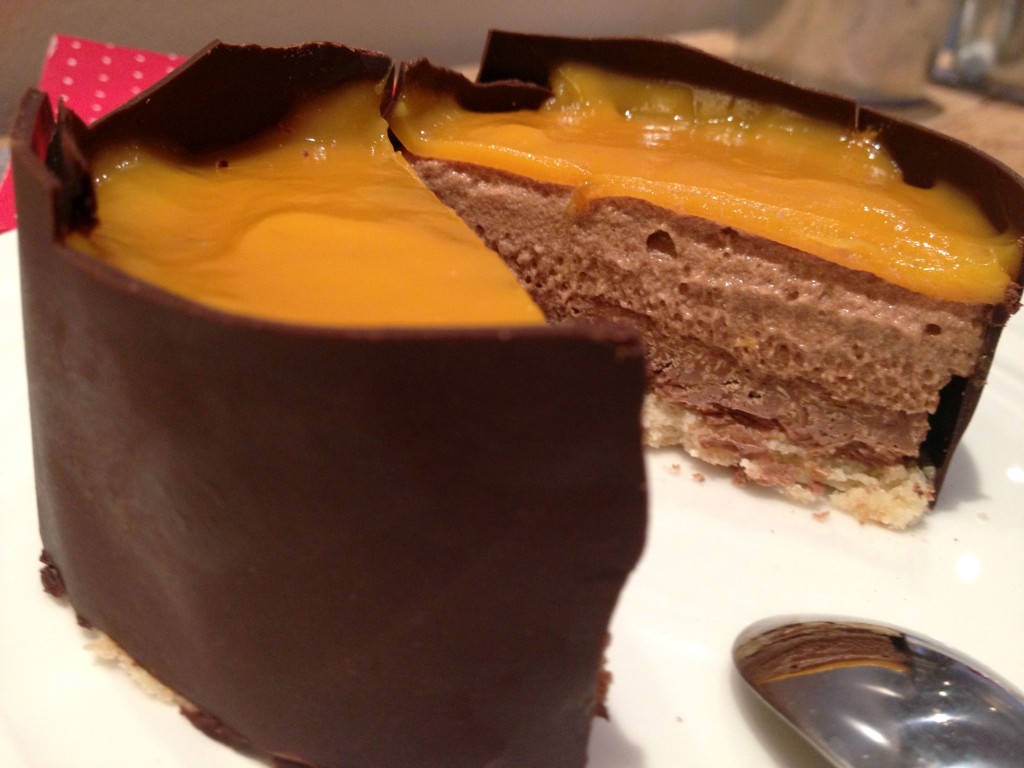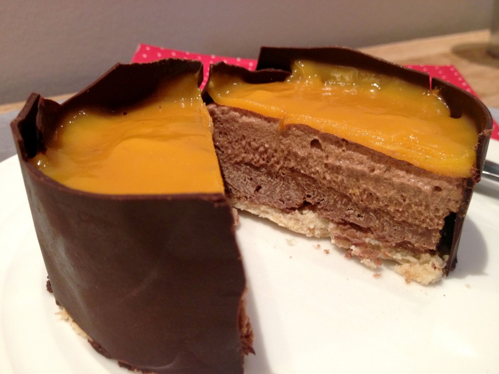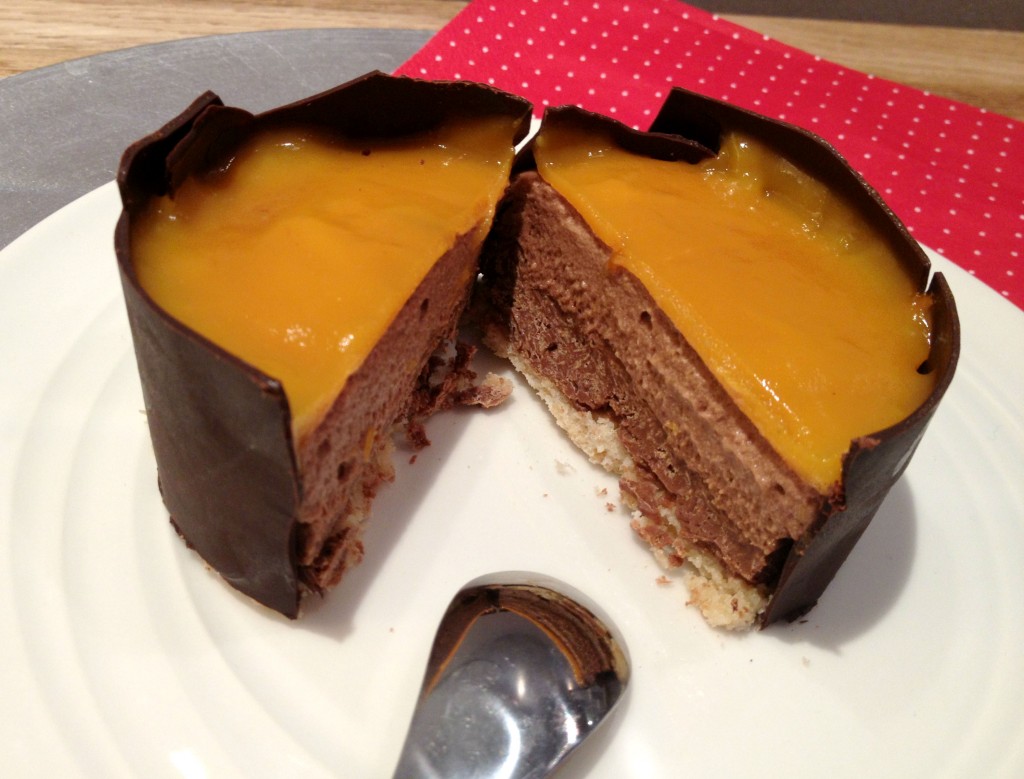 Aujourd’hui je vous propose une recette un peu plus compliquée à faire dans la mesure où ce dessert nécessite la réalisation de cinq préparations différentes : une dacquoise à la noix de coco, un croustillant praliné, une mousse légère au chocolat au lait, une gelée aux fruits de la passion et enfin une coque en chocolat noir. Pfioouuu rien que de tout écrire ça me fatigue!