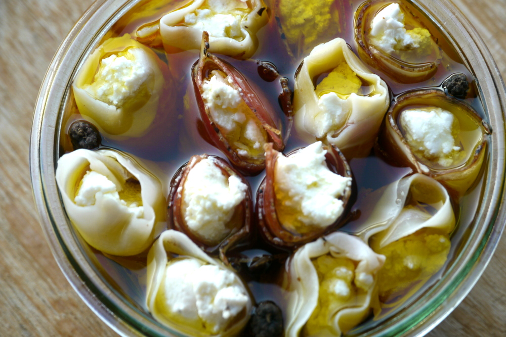 Ajoutez au fromage quelques tours de moulin à poivre, mélangez énergiquement à l’aide d’un fouet ou d’une fourchette pour le détendre. Coupez la tranche de speck en 2 dans le sens de la largueur ; le plus simple c’est d’utiliser une paire de ciseaux. A l’extrémité découpée, placez l’équivalent d’un c.c. de fromage puis roulez. Placez le ensuite dans un récipient, ajoutez le poivre long et recouvrez entièrement d’huile d’olive.