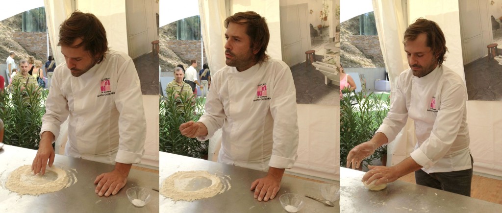 Je passerais rapidement sur le physique agréable, la disponibilité, la gentillesse, et le côté totalement passionné de ce boulanger atypique, pour vous parler uniquement de la recette qu’il a réalisé devant nos yeux : une focaccia à l’huile d’olive.