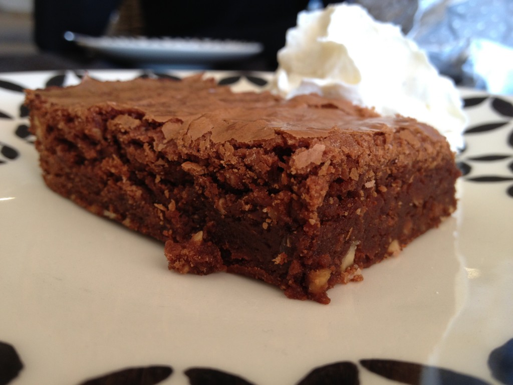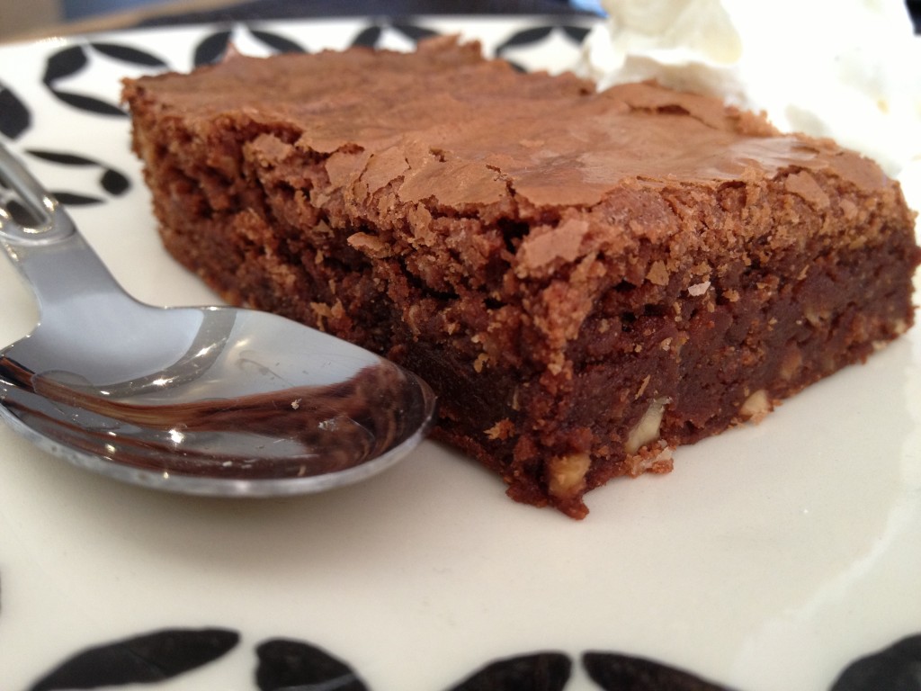 Les brownies étaient juchés sur une assiette blanche, prêts à être dévorés par les estomacs d’adolescents que nous étions. Je me souviens de leur croûte épaisse et fissurée, dévoilant à la première bouchée un intérieur chocolaté « chewy »,et, en fin de bouche, des quelques brisures de noix de pécan pour le croquant. Simple et délicieux.
