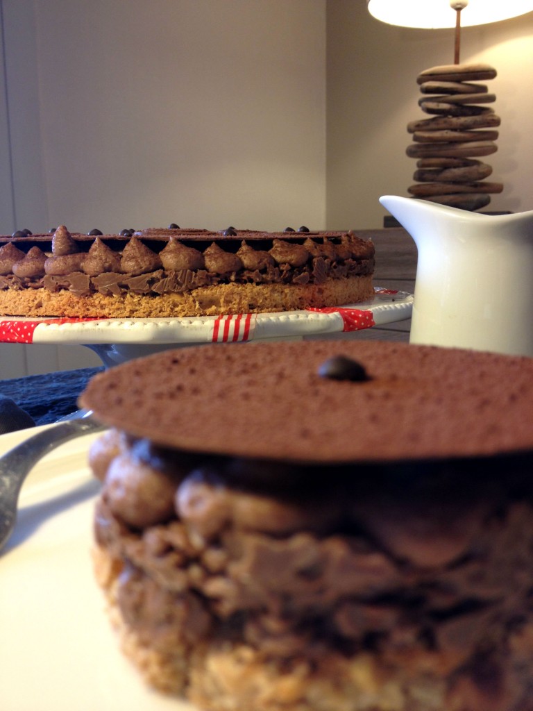 J’ai réalisé ce gâteau aujourd’hui. tout ce passait bien jusqu’au moment de fouetter la crème chocolatée. Elle avait pris en masse depuis hier soir et pas moyen de la faire devenir chantilly….. du coup j’ai monté de la crème en chantilly que j’ai rajouté au mélange crème chocolat… c’est du coup un peu plus liquide que ce que ça devrait être.
