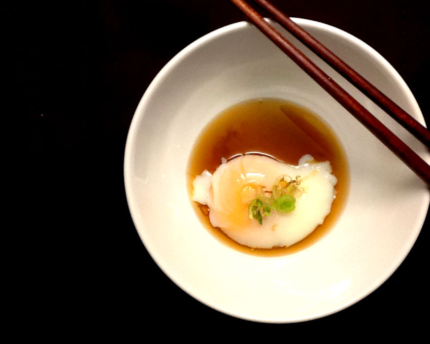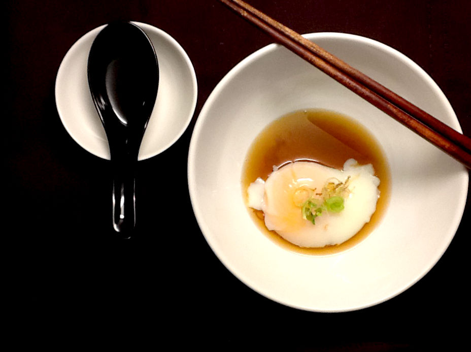 - Pour ma part, j’ai servi l’oeuf de façon assez traditionnelle, dans un bol avec juste un peu de sauce tsuyu (mélange de soja, mirin, sucre et dashi) et parsemé d’oignons nouveaux ciselés et de quelques flocons de bonite séchée.