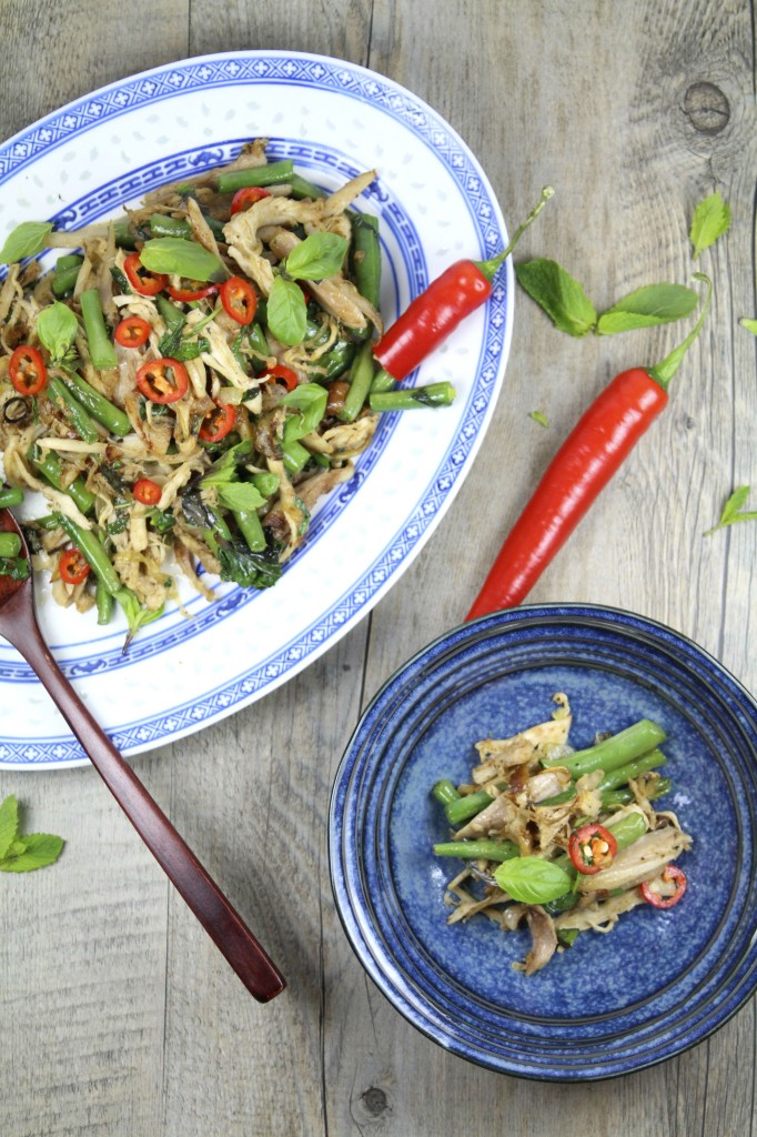 Aujourd’hui c’est en Asie qu’on part avec une recette tirée du site d’Andrea Nguyen que j’ai arrangé à ma façon. Il s’agit de poulet sauté au basilic avec des haricots verts et une sauce yummy yummy. N’hésitez pas à vous approprier la recette en mélangeant d’autres herbes (coriandre, basilic thaï…) en rajoutant quelques légumes (champignons…) ou en remplaçant le poulet par du tofu pour les veggiecookers ou par d’autres viandes. Le seul point un peu technique de la recette c’est de doser les ingrédients de la sauce afin d’avoir un bon équilibre des saveurs. Les proportions que je vous donne sont pour 2-3 personnes en fonction des appétits et de si vous servez d’autres plats avec. En effet, dans la cuisine asiatique on sert souvent plusieurs plats que l’on partage…à vous de voir.