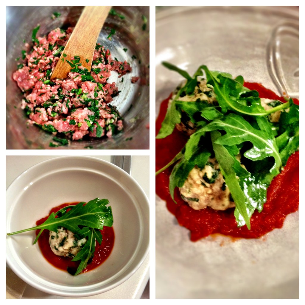 Dans une grande casserole d’eau en ébullition plongez vos verts de blettes 1 min. Une fois égouttés, pressez-les fortement pour en extraire un maximum d’eau puis hachez les menus. Dans un saladier, cassez l’œuf, ajoutez les blettes, la viande et assaisonnez avec du sel, poivre et râpez un peu de noix de muscade. Malaxez pour obtenir un mélange homogène. Confectionnez de petites boulettes entre vos mains de la taille d’une balle de ping-pong et roulez-les dans la farine. Pendant ce temps faites bouillir de l’eau salée. Plongez vos « ravioli » environ 4 minutes tout en conservant l’ébullition. Sortez les de l’eau et réservez pour qu’ils s’égouttent dans une assiette le temps du dressage. Les ravioli doivent rester moelleux, mais attention à ce qu’ils soient malgré tout cuits en leur centre.