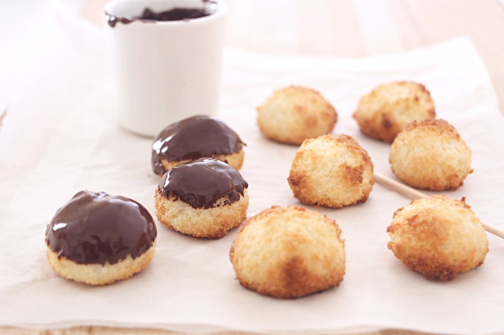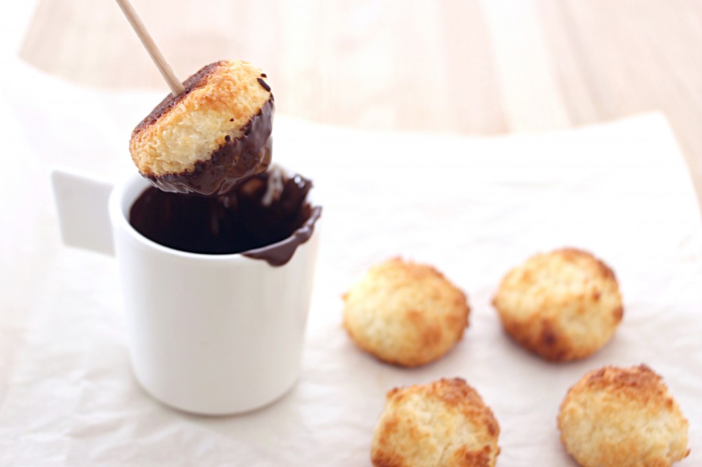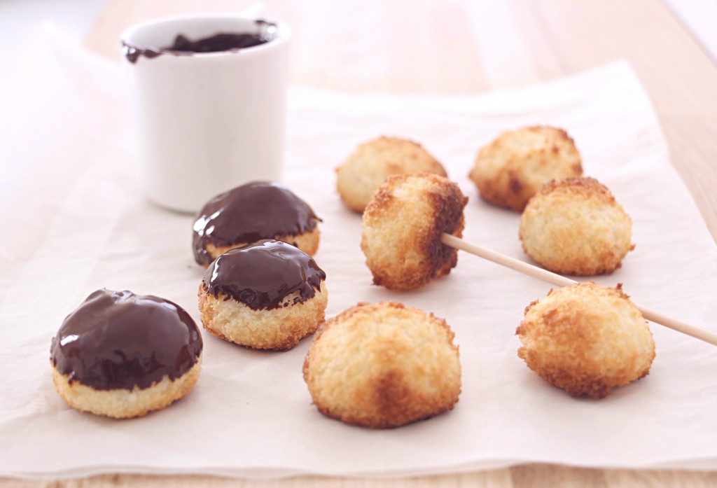 Pour l’option chocolatée : faites fondre le chocolat au micro-ondes ou au bain marie en ajoutant l’huile de coco. Trempez les rochers coco à l’aide d’un cure dent et réservez les au réfrigérateur pour faire figer le chocolat.