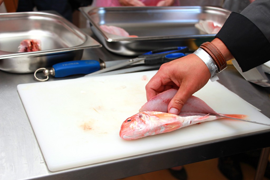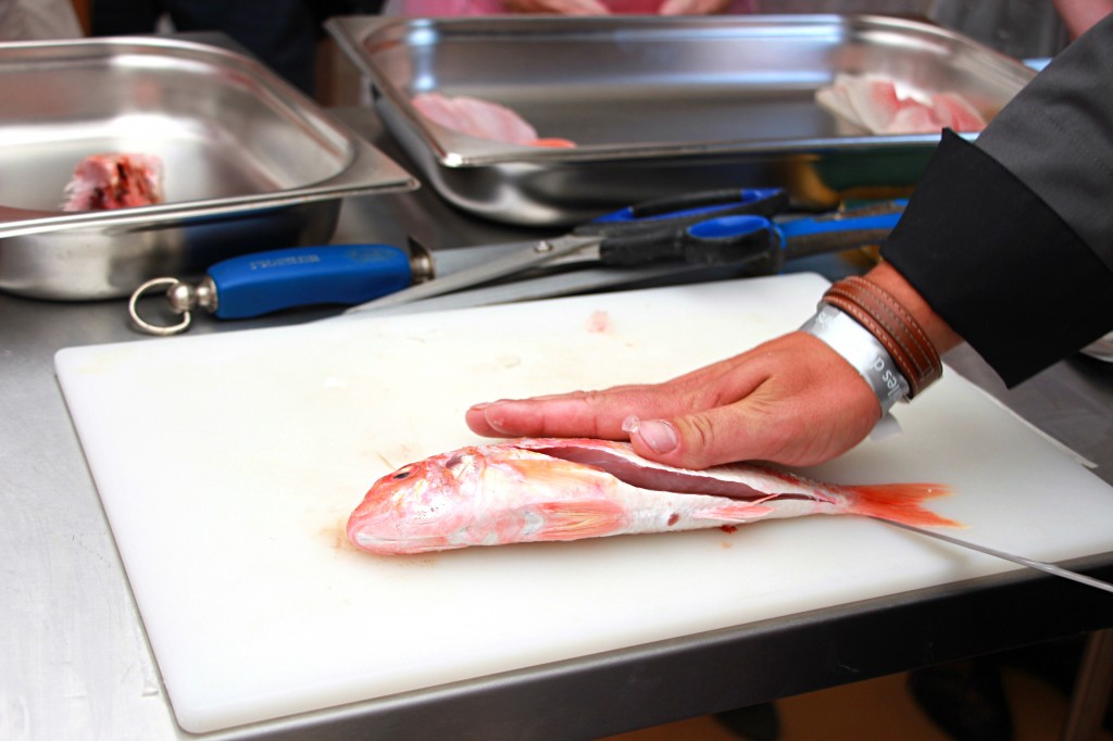 Écaillez et levez les rougets par le ventre en enlevant la tête sans aller jusqu’au dos afin de pouvoir retirer l’arrête centrale et garder les filets ensemble par le dos.
